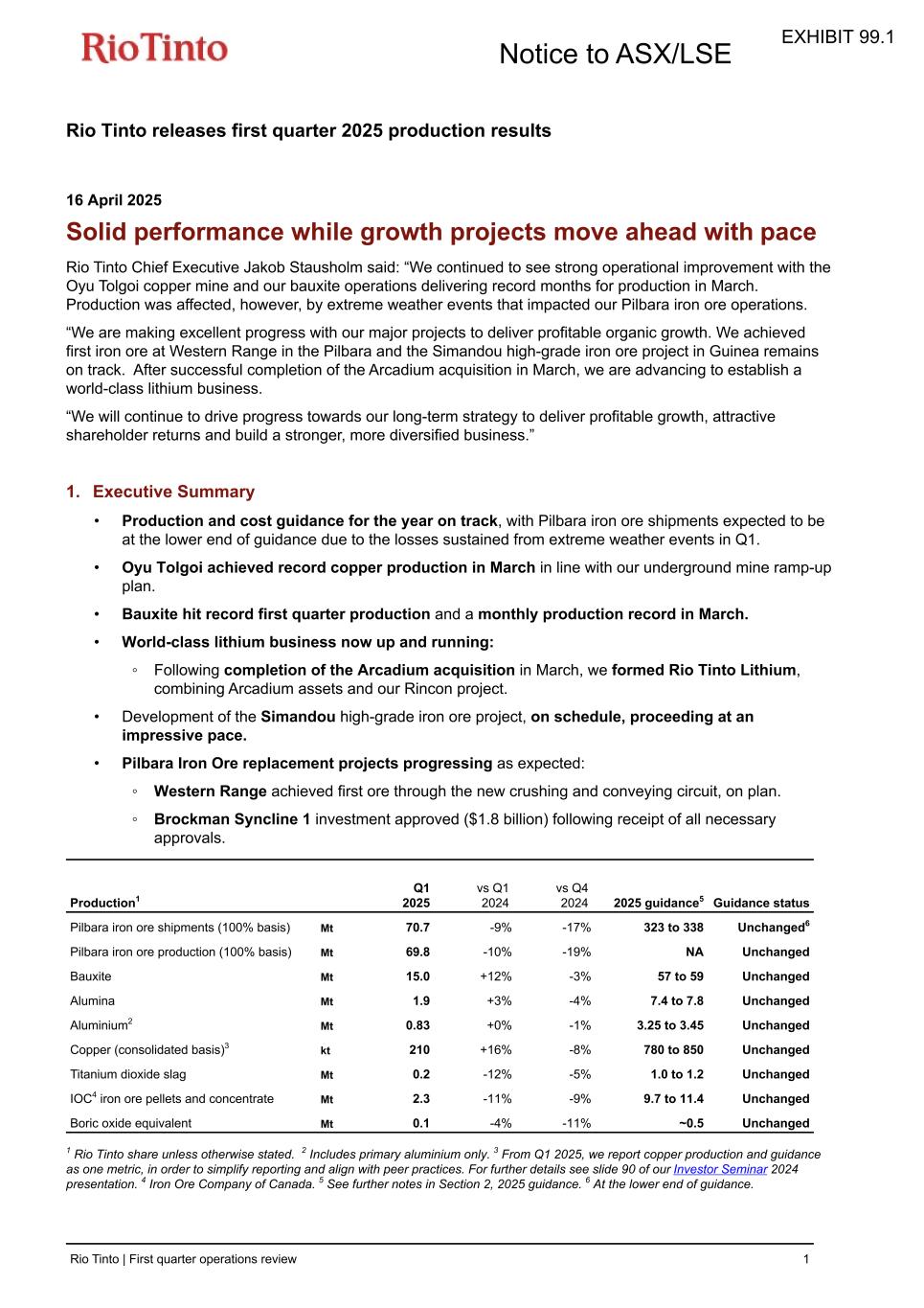 Rio Tinto releases first quarter 2025 production results 16 April 2025 Solid performance while growth projects move ahead with pace Rio Tinto Chief Executive Jakob Stausholm said: “We continued to see strong operational improvement with the Oyu Tolgoi copper mine and our bauxite operations delivering record months for production in March. Production was affected, however, by extreme weather events that impacted our Pilbara iron ore operations. “We are making excellent progress with our major projects to deliver profitable organic growth. We achieved first iron ore at Western Range in the Pilbara and the Simandou high-grade iron ore project in Guinea remains on track. After successful completion of the Arcadium acquisition in March, we are advancing to establish a world-class lithium business. “We will continue to drive progress towards our long-term strategy to deliver profitable growth, attractive shareholder returns and build a stronger, more diversified business.” 1. Executive Summary • Production and cost guidance for the year on track, with Pilbara iron ore shipments expected to be at the lower end of guidance due to the losses sustained from extreme weather events in Q1. • Oyu Tolgoi achieved record copper production in March in line with our underground mine ramp-up plan. • Bauxite hit record first quarter production and a monthly production record in March. • World-class lithium business now up and running: ◦ Following completion of the Arcadium acquisition in March, we formed Rio Tinto Lithium, combining Arcadium assets and our Rincon project. • Development of the Simandou high-grade iron ore project, on schedule, proceeding at an impressive pace. • Pilbara Iron Ore replacement projects progressing as expected: ◦ Western Range achieved first ore through the new crushing and conveying circuit, on plan. ◦ Brockman Syncline 1 investment approved ($1.8 billion) following receipt of all necessary approvals. Production1 Q1 2025 vs Q1 2024 vs Q4 2024 2025 guidance5 Guidance status Pilbara iron ore shipments (100% basis) Mt 70.7 -9 % -17 % 323 to 338 Unchanged6 Pilbara iron ore production (100% basis) Mt 69.8 -10 % -19 % NA Unchanged Bauxite Mt 15.0 +12 % -3 % 57 to 59 Unchanged Alumina Mt 1.9 +3 % -4 % 7.4 to 7.8 Unchanged Aluminium2 Mt 0.83 +0 % -1 % 3.25 to 3.45 Unchanged Copper (consolidated basis)3 kt 210 +16 % -8 % 780 to 850 Unchanged Titanium dioxide slag Mt 0.2 -12 % -5 % 1.0 to 1.2 Unchanged IOC4 iron ore pellets and concentrate Mt 2.3 -11 % -9 % 9.7 to 11.4 Unchanged Boric oxide equivalent Mt 0.1 -4 % -11 % ~0.5 Unchanged 1 Rio Tinto share unless otherwise stated. 2 Includes primary aluminium only. 3 From Q1 2025, we report copper production and guidance as one metric, in order to simplify reporting and align with peer practices. For further details see slide 90 of our Investor Seminar 2024 presentation. 4 Iron Ore Company of Canada. 5 See further notes in Section 2, 2025 guidance. 6 At the lower end of guidance. Notice to ASX/LSE Rio Tinto | First quarter operations review 1 EXHIBIT 99.1