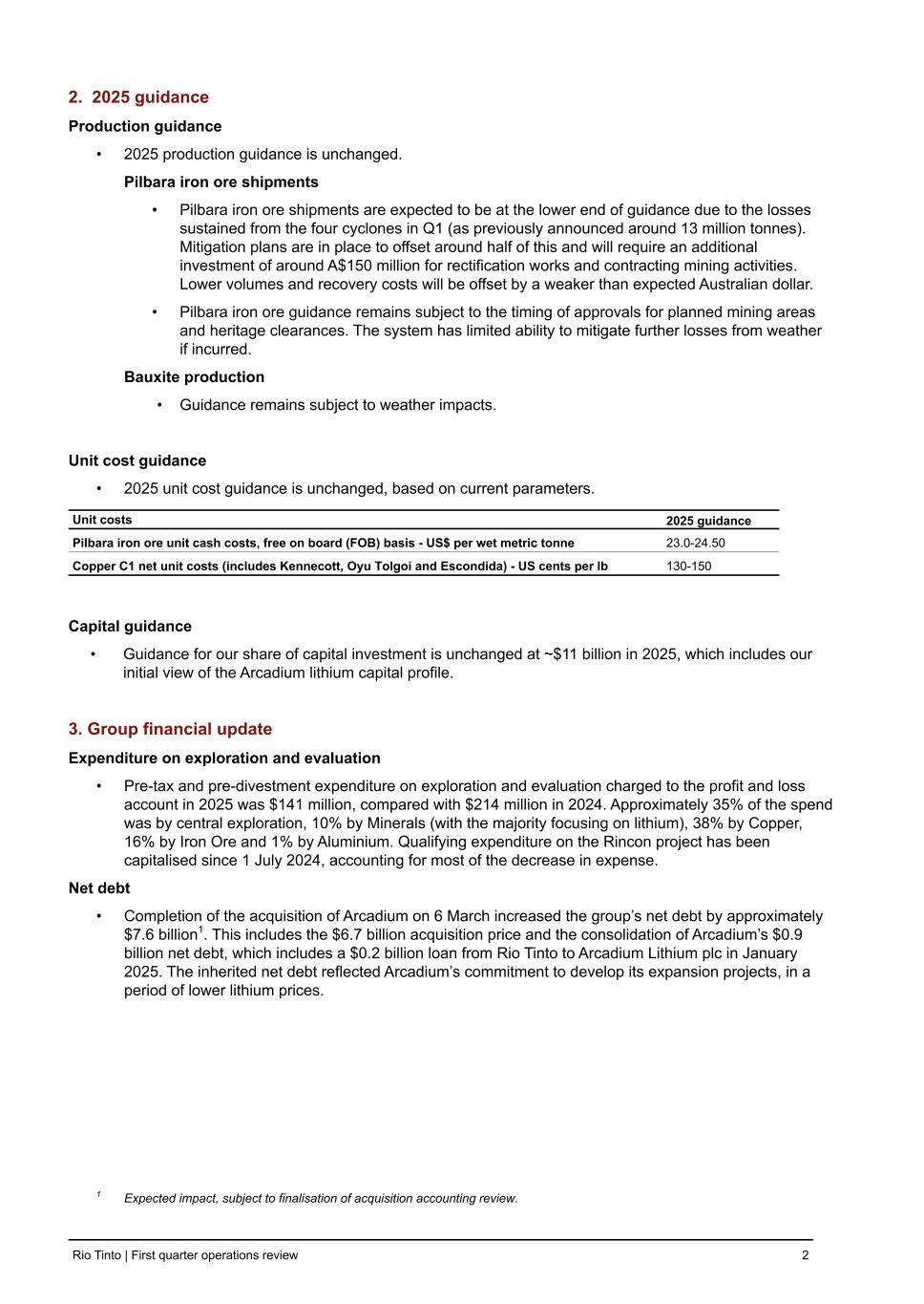 2. 2025 guidance Production guidance • 2025 production guidance is unchanged. Pilbara iron ore shipments • Pilbara iron ore shipments are expected to be at the lower end of guidance due to the losses sustained from the four cyclones in Q1 (as previously announced around 13 million tonnes). Mitigation plans are in place to offset around half of this and will require an additional investment of around A$150 million for rectification works and contracting mining activities. Lower volumes and recovery costs will be offset by a weaker than expected Australian dollar. • Pilbara iron ore guidance remains subject to the timing of approvals for planned mining areas and heritage clearances. The system has limited ability to mitigate further losses from weather if incurred. Bauxite production • Guidance remains subject to weather impacts. Unit cost guidance • 2025 unit cost guidance is unchanged, based on current parameters. Unit costs 2025 guidance Pilbara iron ore unit cash costs, free on board (FOB) basis - US$ per wet metric tonne 23.0-24.50 Copper C1 net unit costs (includes Kennecott, Oyu Tolgoi and Escondida) - US cents per lb 130-150 Capital guidance • Guidance for our share of capital investment is unchanged at ~$11 billion in 2025, which includes our initial view of the Arcadium lithium capital profile. 3. Group financial update Expenditure on exploration and evaluation • Pre-tax and pre-divestment expenditure on exploration and evaluation charged to the profit and loss account in 2025 was $141 million, compared with $214 million in 2024. Approximately 35% of the spend was by central exploration, 10% by Minerals (with the majority focusing on lithium), 38% by Copper, 16% by Iron Ore and 1% by Aluminium. Qualifying expenditure on the Rincon project has been capitalised since 1 July 2024, accounting for most of the decrease in expense. Net debt • Completion of the acquisition of Arcadium on 6 March increased the group’s net debt by approximately $7.6 billion1. This includes the $6.7 billion acquisition price and the consolidation of Arcadium’s $0.9 billion net debt, which includes a $0.2 billion loan from Rio Tinto to Arcadium Lithium plc in January 2025. The inherited net debt reflected Arcadium’s commitment to develop its expansion projects, in a period of lower lithium prices. 1 Expected impact, subject to finalisation of acquisition accounting review. Rio Tinto | First quarter operations review 2