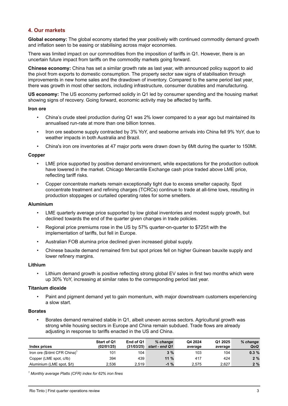 4. Our markets Global economy: The global economy started the year positively with continued commodity demand growth and inflation seen to be easing or stabilising across major economies. There was limited impact on our commodities from the imposition of tariffs in Q1. However, there is an uncertain future impact from tariffs on the commodity markets going forward. Chinese economy: China has set a similar growth rate as last year, with announced policy support to aid the pivot from exports to domestic consumption. The property sector saw signs of stabilisation through improvements in new home sales and the drawdown of inventory. Compared to the same period last year, there was growth in most other sectors, including infrastructure, consumer durables and manufacturing. US economy: The US economy performed solidly in Q1 led by consumer spending and the housing market showing signs of recovery. Going forward, economic activity may be affected by tariffs. Iron ore • China’s crude steel production during Q1 was 2% lower compared to a year ago but maintained its annualised run-rate at more than one billion tonnes. • Iron ore seaborne supply contracted by 3% YoY, and seaborne arrivals into China fell 9% YoY, due to weather impacts in both Australia and Brazil. • China's iron ore inventories at 47 major ports were drawn down by 6Mt during the quarter to 150Mt. Copper • LME price supported by positive demand environment, while expectations for the production outlook have lowered in the market. Chicago Mercantile Exchange cash price traded above LME price, reflecting tariff risks. • Copper concentrate markets remain exceptionally tight due to excess smelter capacity. Spot concentrate treatment and refining charges (TCRCs) continue to trade at all-time lows, resulting in production stoppages or curtailed operating rates for some smelters. Aluminium • LME quarterly average price supported by low global inventories and modest supply growth, but declined towards the end of the quarter given changes in trade policies. • Regional price premiums rose in the US by 57% quarter-on-quarter to $725/t with the implementation of tariffs, but fell in Europe. • Australian FOB alumina price declined given increased global supply. • Chinese bauxite demand remained firm but spot prices fell on higher Guinean bauxite supply and lower refinery margins. Lithium • Lithium demand growth is positive reflecting strong global EV sales in first two months which were up 30% YoY, increasing at similar rates to the corresponding period last year. Titanium dioxide • Paint and pigment demand yet to gain momentum, with major downstream customers experiencing a slow start. Borates • Borates demand remained stable in Q1, albeit uneven across sectors. Agricultural growth was strong while housing sectors in Europe and China remain subdued. Trade flows are already adjusting in response to tariffs enacted in the US and China. Index prices Start of Q1 (02/01/25) End of Q1 (31/03/25) % change start - end Q1 Q4 2024 average Q1 2025 average % change QoQ Iron ore ($/dmt CFR China)1 101 104 3 % 103 104 0.3 % Copper (LME spot, c/lb) 394 439 11 % 417 424 2 % Aluminium (LME spot, $/t) 2,536 2,519 -1 % 2,575 2,627 2 % 1 Monthly average Platts (CFR) index for 62% iron fines Rio Tinto | First quarter operations review 3