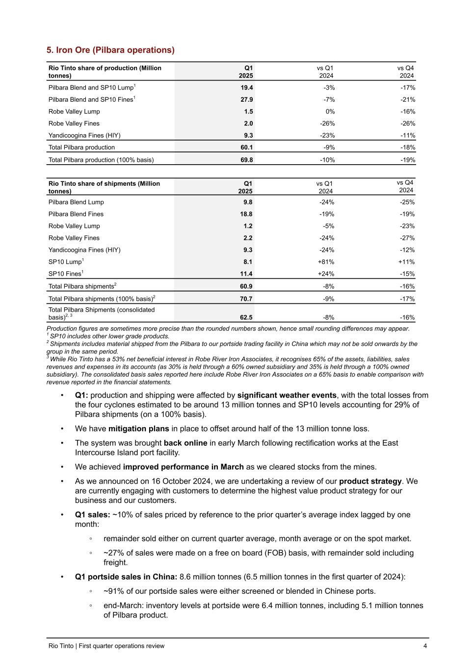 5. Iron Ore (Pilbara operations) Rio Tinto share of production (Million tonnes) Q1 2025 vs Q1 2024 vs Q4 2024 Pilbara Blend and SP10 Lump1 19.4 -3 % -17 % Pilbara Blend and SP10 Fines1 27.9 -7 % -21 % Robe Valley Lump 1.5 0 % -16 % Robe Valley Fines 2.0 -26 % -26 % Yandicoogina Fines (HIY) 9.3 -23 % -11 % Total Pilbara production 60.1 -9 % -18 % Total Pilbara production (100% basis) 69.8 -10 % -19 % Rio Tinto share of shipments (Million tonnes) Q1 2025 vs Q1 2024 vs Q4 2024 Pilbara Blend Lump 9.8 -24 % -25 % Pilbara Blend Fines 18.8 -19 % -19 % Robe Valley Lump 1.2 -5 % -23 % Robe Valley Fines 2.2 -24 % -27 % Yandicoogina Fines (HIY) 9.3 -24 % -12 % SP10 Lump1 8.1 +81 % +11 % SP10 Fines1 11.4 +24 % -15 % Total Pilbara shipments2 60.9 -8 % -16 % Total Pilbara shipments (100% basis)2 70.7 -9 % -17 % Total Pilbara Shipments (consolidated basis)2, 3 62.5 -8 % -16 % Production figures are sometimes more precise than the rounded numbers shown, hence small rounding differences may appear. 1 SP10 includes other lower grade products. 2 Shipments includes material shipped from the Pilbara to our portside trading facility in China which may not be sold onwards by the group in the same period. 3 While Rio Tinto has a 53% net beneficial interest in Robe River Iron Associates, it recognises 65% of the assets, liabilities, sales revenues and expenses in its accounts (as 30% is held through a 60% owned subsidiary and 35% is held through a 100% owned subsidiary). The consolidated basis sales reported here include Robe River Iron Associates on a 65% basis to enable comparison with revenue reported in the financial statements. • Q1: production and shipping were affected by significant weather events, with the total losses from the four cyclones estimated to be around 13 million tonnes and SP10 levels accounting for 29% of Pilbara shipments (on a 100% basis). • We have mitigation plans in place to offset around half of the 13 million tonne loss. • The system was brought back online in early March following rectification works at the East Intercourse Island port facility. • We achieved improved performance in March as we cleared stocks from the mines. • As we announced on 16 October 2024, we are undertaking a review of our product strategy. We are currently engaging with customers to determine the highest value product strategy for our business and our customers. • Q1 sales: ~10% of sales priced by reference to the prior quarter’s average index lagged by one month: ◦ remainder sold either on current quarter average, month average or on the spot market. ◦ ~27% of sales were made on a free on board (FOB) basis, with remainder sold including freight. • Q1 portside sales in China: 8.6 million tonnes (6.5 million tonnes in the first quarter of 2024): ◦ ~91% of our portside sales were either screened or blended in Chinese ports. ◦ end-March: inventory levels at portside were 6.4 million tonnes, including 5.1 million tonnes of Pilbara product. Rio Tinto | First quarter operations review 4