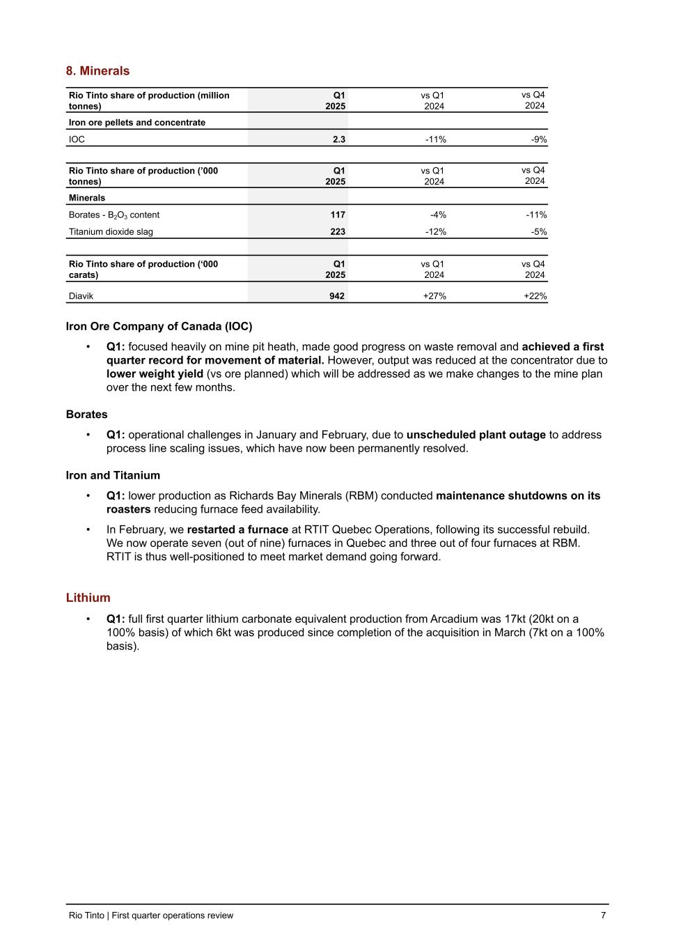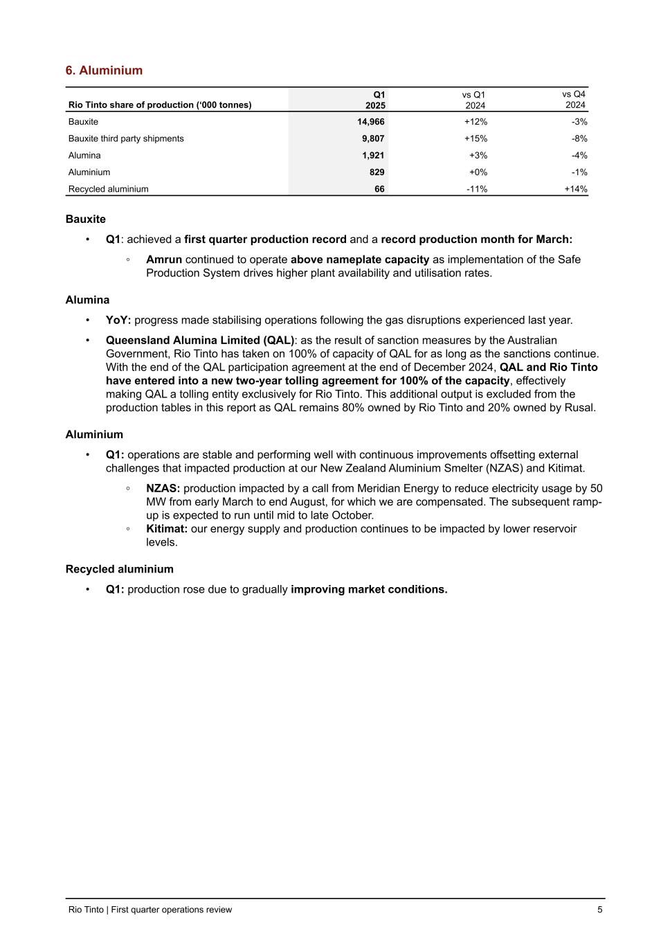 6. Aluminium Rio Tinto share of production (‘000 tonnes) Q1 2025 vs Q1 2024 vs Q4 2024 Bauxite 14,966 +12 % -3 % Bauxite third party shipments 9,807 +15 % -8 % Alumina 1,921 +3 % -4 % Aluminium 829 +0 % -1 % Recycled aluminium 66 -11 % +14 % Bauxite • Q1: achieved a first quarter production record and a record production month for March: ◦ Amrun continued to operate above nameplate capacity as implementation of the Safe Production System drives higher plant availability and utilisation rates. Alumina • YoY: progress made stabilising operations following the gas disruptions experienced last year. • Queensland Alumina Limited (QAL): as the result of sanction measures by the Australian Government, Rio Tinto has taken on 100% of capacity of QAL for as long as the sanctions continue. With the end of the QAL participation agreement at the end of December 2024, QAL and Rio Tinto have entered into a new two-year tolling agreement for 100% of the capacity, effectively making QAL a tolling entity exclusively for Rio Tinto. This additional output is excluded from the production tables in this report as QAL remains 80% owned by Rio Tinto and 20% owned by Rusal. Aluminium • Q1: operations are stable and performing well with continuous improvements offsetting external challenges that impacted production at our New Zealand Aluminium Smelter (NZAS) and Kitimat. ◦ NZAS: production impacted by a call from Meridian Energy to reduce electricity usage by 50 MW from early March to end August, for which we are compensated. The subsequent ramp- up is expected to run until mid to late October. ◦ Kitimat: our energy supply and production continues to be impacted by lower reservoir levels. Recycled aluminium • Q1: production rose due to gradually improving market conditions. Rio Tinto | First quarter operations review 5
