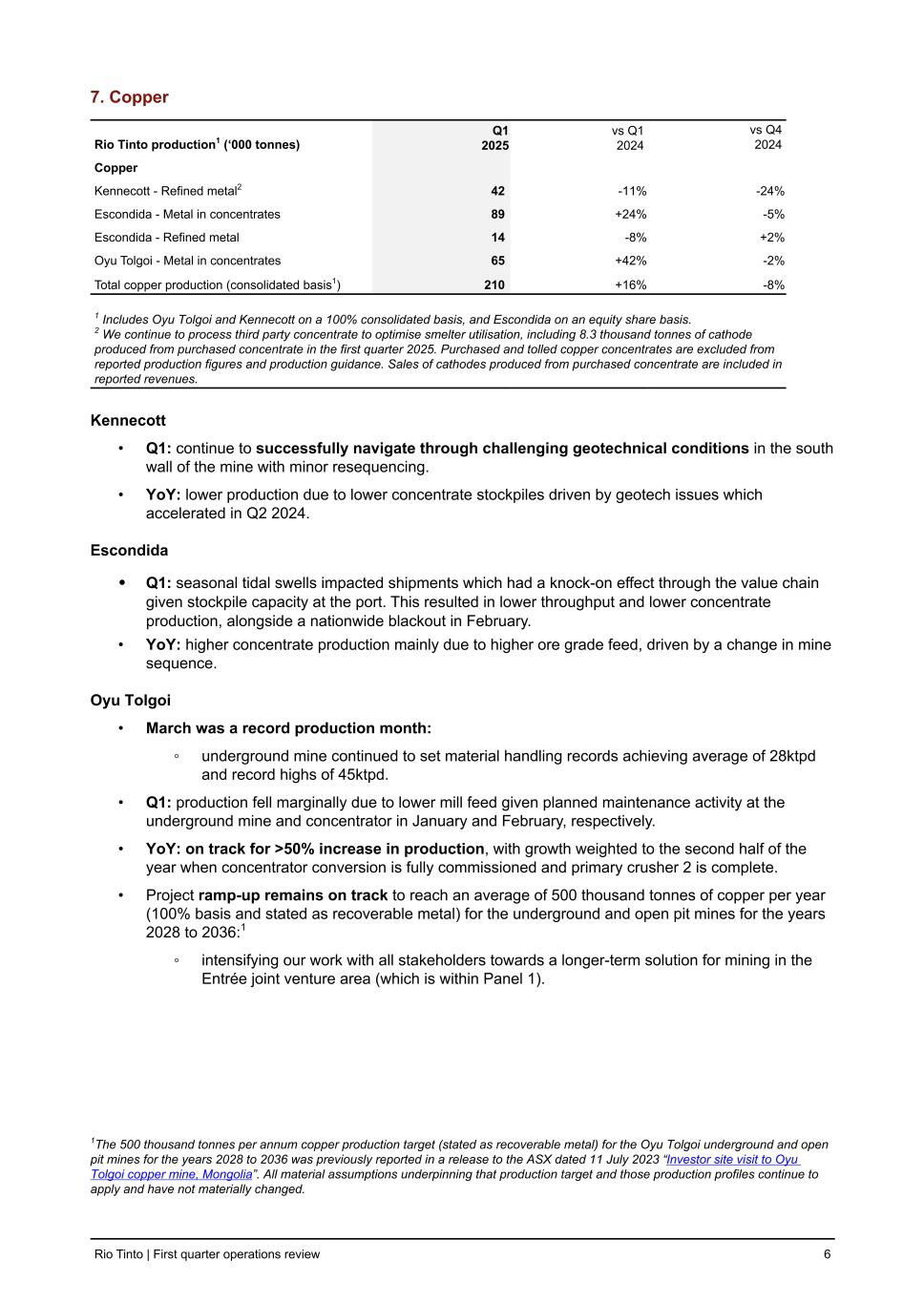7. Copper Rio Tinto production1 (‘000 tonnes) Q1 2025 vs Q1 2024 vs Q4 2024 Copper Kennecott - Refined metal2 42 -11 % -24 % Escondida - Metal in concentrates 89 +24 % -5 % Escondida - Refined metal 14 -8 % +2 % Oyu Tolgoi - Metal in concentrates 65 +42 % -2 % Total copper production (consolidated basis1) 210 +16 % -8 % 1 Includes Oyu Tolgoi and Kennecott on a 100% consolidated basis, and Escondida on an equity share basis. 2 We continue to process third party concentrate to optimise smelter utilisation, including 8.3 thousand tonnes of cathode produced from purchased concentrate in the first quarter 2025. Purchased and tolled copper concentrates are excluded from reported production figures and production guidance. Sales of cathodes produced from purchased concentrate are included in reported revenues. Kennecott • Q1: continue to successfully navigate through challenging geotechnical conditions in the south wall of the mine with minor resequencing. • YoY: lower production due to lower concentrate stockpiles driven by geotech issues which accelerated in Q2 2024. Escondida • Q1: seasonal tidal swells impacted shipments which had a knock-on effect through the value chain given stockpile capacity at the port. This resulted in lower throughput and lower concentrate production, alongside a nationwide blackout in February. • YoY: higher concentrate production mainly due to higher ore grade feed, driven by a change in mine sequence. Oyu Tolgoi • March was a record production month: ◦ underground mine continued to set material handling records achieving average of 28ktpd and record highs of 45ktpd. • Q1: production fell marginally due to lower mill feed given planned maintenance activity at the underground mine and concentrator in January and February, respectively. • YoY: on track for >50% increase in production, with growth weighted to the second half of the year when concentrator conversion is fully commissioned and primary crusher 2 is complete. • Project ramp-up remains on track to reach an average of 500 thousand tonnes of copper per year (100% basis and stated as recoverable metal) for the underground and open pit mines for the years 2028 to 2036:1 ◦ intensifying our work with all stakeholders towards a longer-term solution for mining in the Entrée joint venture area (which is within Panel 1). 1The 500 thousand tonnes per annum copper production target (stated as recoverable metal) for the Oyu Tolgoi underground and open pit mines for the years 2028 to 2036 was previously reported in a release to the ASX dated 11 July 2023 “Investor site visit to Oyu Tolgoi copper mine, Mongolia”. All material assumptions underpinning that production target and those production profiles continue to apply and have not materially changed. Rio Tinto | First quarter operations review 6