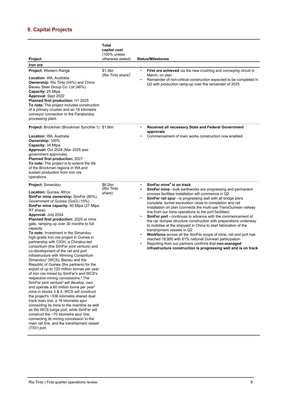 9. Capital Projects Project Total capital cost (100% unless otherwise stated) Status/Milestones Iron ore Project: Western Range Location: WA, Australia Ownership: Rio Tinto (54%) and China Baowu Steel Group Co. Ltd (46%) Capacity: 25 Mtpa Approval: Sept 2022 Planned first production: H1 2025 To note: The project includes construction of a primary crusher and an 18 kilometre conveyor connection to the Paraburdoo processing plant. $1.3bn (Rio Tinto share)1 • First ore achieved via the new crushing and conveying circuit in March, on plan • Remainder of non-critical construction expected to be completed in Q2 with production ramp-up over the remainder of 2025 Project: Brockman (Brockman Syncline 1) Location: WA, Australia Ownership: 100% Capacity: 34 Mtpa Approval: Oct 2024 (Mar 2025 was government approvals) Planned first production: 2027 To note: The project is to extend the life of the Brockman regions in WA and sustain production from iron ore operations $1.8bn • Received all necessary State and Federal Government approvals • Commencement of main works construction now enabled Project: Simandou Location: Guinea, Africa SimFer mine ownership: SimFer (85%), Government of Guinea (GoG) (15%) SimFer mine capacity: 60 Mtpa (27 Mtpa RT share) Approval: July 2024 Planned first production: 2025 at mine gate, ramping up over 30 months to full capacity To note: Investment in the Simandou high-grade iron ore project in Guinea in partnership with CIOH, a Chinalco-led consortium (the SimFer joint venture) and co-development of the rail and port infrastructure with Winning Consortium Simandou² (WCS), Baowu and the Republic of Guinea (the partners) for the export of up to 120 million tonnes per year of iron ore mined by SimFer's and WCS's respective mining concessions.³ The SimFer joint venture⁴ will develop, own and operate a 60 million tonne per year⁵ mine in blocks 3 & 4. WCS will construct the project's ~536 kilometre shared dual track main line, a 16 kilometre spur connecting its mine to the mainline as well as the WCS barge port, while SimFer will construct the ~70 kilometre spur line, connecting its mining concession to the main rail line, and the transhipment vessel (TSV) port. $6.2bn (Rio Tinto share) • SimFer mine4 is on track • SimFer mine - bulk earthworks are progressing and permanent process facilities installation will commence in Q2 • SimFer rail spur - is progressing well with all bridge piers complete, tunnel excavation close to completion and rail installation on plan (connects the multi-use TransGuinean railway line from our mine operations to the port facilities) • SimFer port - continues to advance with the commencement of the car dumper structure construction with preparations underway to mobilise at the shipyard in China to start fabrication of the transhipment vessels in Q2 • Workforce across all the SimFer scope of mine, rail and port has reached 18,900 with 81% national Guinean participation • Reporting from our partners confirms that non-managed infrastructure construction is progressing well and is on track Rio Tinto | First quarter operations review 8