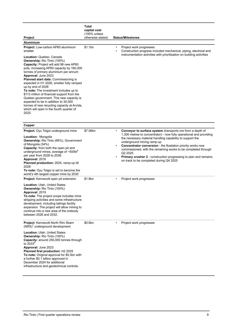Project Total capital cost (100% unless otherwise stated) Status/Milestones Aluminium Project: Low-carbon AP60 aluminium smelter Location: Quebec, Canada Ownership: Rio Tinto (100%) Capacity: Project will add 96 new AP60 pots, increasing AP60 capacity by 160,000 tonnes of primary aluminium per annum Approval: June 2023 Planned start date: Commissioning is expected in H1 2026, smelter fully ramped up by end of 2026 To note: The investment includes up to $113 million of financial support from the Quebec government. This new capacity is expected to be in addition to 30,000 tonnes of new recycling capacity at Arvida, which will open in the fourth quarter of 2025. $1.1bn • Project work progresses • Construction progress included mechanical, piping, electrical and instrumentation activities with prioritisation on building activities Copper Project: Oyu Tolgoi underground mine Location: Mongolia Ownership: Rio Tinto (66%), Government of Mongolia (34%) Capacity: from both the open pit and underground mines, average of ~500kt6 per year from 2028 to 2036. Approval: 2016 Planned production: 2024, ramp-up till 2028 To note: Oyu Tolgoi is set to become the world’s 4th largest copper mine by 2030 $7.06bn • Conveyor to surface system (transports ore from a depth of 1,300 metres to concentrator) - now fully operational and providing the necessary material handling capability to support the underground mining ramp-up • Concentrator conversion - the floatation priority works now commissioned, with the remaining works to be completed through Q2 2025 • Primary crusher 2 - construction progressing to plan and remains on track to be completed during Q4 2025 Project: Kennecott open pit extension Location: Utah, United States Ownership: Rio Tinto (100%) Approval: 2019 To note: The project scope includes mine stripping activities and some infrastructure development, including tailings facility expansion. The project will allow mining to continue into a new area of the orebody between 2026 and 2032. $1.8bn • Project work progresses Project: Kennecott North Rim Skarn (NRS)7 underground development Location: Utah, United States Ownership: Rio Tinto (100%) Capacity: around 250,000 tonnes through to 20338 Approval: June 2023 Planned first production: H2 2025 To note: Original approval for $0.5bn with a further $0.1 billion approved in December 2024 for additional infrastructure and geotechnical controls. $0.6bn • Project work progresses Rio Tinto | First quarter operations review 9