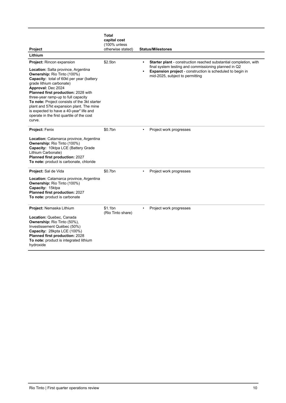 Project Total capital cost (100% unless otherwise stated) Status/Milestones Lithium Project: Rincon expansion Location: Salta province, Argentina Ownership: Rio Tinto (100%) Capacity: total of 60kt per year (battery grade lithium carbonate) Approval: Dec 2024 Planned first production: 2028 with three-year ramp-up to full capacity To note: Project consists of the 3kt starter plant and 57kt expansion plant. The mine is expected to have a 40-year⁹ life and operate in the first quartile of the cost curve. $2.5bn • Starter plant - construction reached substantial completion, with final system testing and commissioning planned in Q2 • Expansion project - construction is scheduled to begin in mid-2025, subject to permitting Project: Fenix Location: Catamarca province, Argentina Ownership: Rio Tinto (100%) Capacity: 10ktpa LCE (Battery Grade Lithium Carbonate) Planned first production: 2027 To note: product is carbonate, chloride $0.7bn • Project work progresses Project: Sal de Vida Location: Catamarca province, Argentina Ownership: Rio Tinto (100%) Capacity: 15ktpa Planned first production: 2027 To note: product is carbonate $0.7bn • Project work progresses Project: Nemaska Lithium Location: Quebec, Canada Ownership: Rio Tinto (50%), Investissement Québec (50%) Capacity: 28kpta LCE (100%) Planned first production: 2028 To note: product is integrated lithium hydroxide $1.1bn (Rio Tinto share) • Project work progresses Rio Tinto | First quarter operations review 10