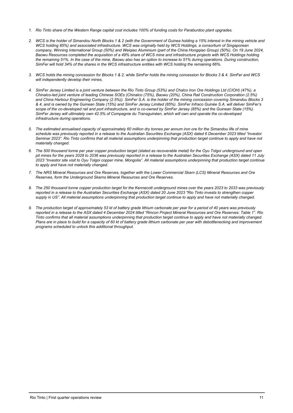 1. Rio Tinto share of the Western Range capital cost includes 100% of funding costs for Paraburdoo plant upgrades. 2. WCS is the holder of Simandou North Blocks 1 & 2 (with the Government of Guinea holding a 15% interest in the mining vehicle and WCS holding 85%) and associated infrastructure. WCS was originally held by WCS Holdings, a consortium of Singaporean company, Winning International Group (50%) and Weiqiao Aluminium (part of the China Hongqiao Group) (50%). On 19 June 2024, Baowu Resources completed the acquisition of a 49% share of WCS mine and infrastructure projects with WCS Holdings holding the remaining 51%. In the case of the mine, Baowu also has an option to increase to 51% during operations. During construction, SimFer will hold 34% of the shares in the WCS infrastructure entities with WCS holding the remaining 66%. 3. WCS holds the mining concession for Blocks 1 & 2, while SimFer holds the mining concession for Blocks 3 & 4. SimFer and WCS will independently develop their mines. 4. SimFer Jersey Limited is a joint venture between the Rio Tinto Group (53%) and Chalco Iron Ore Holdings Ltd (CIOH) (47%), a Chinalco-led joint venture of leading Chinese SOEs (Chinalco (75%), Baowu (20%), China Rail Construction Corporation (2.5%) and China Harbour Engineering Company (2.5%)). SimFer S.A. is the holder of the mining concession covering Simandou Blocks 3 & 4, and is owned by the Guinean State (15%) and SimFer Jersey Limited (85%). SimFer Infraco Guinée S.A. will deliver SimFer’s scope of the co-developed rail and port infrastructure, and is co-owned by SimFer Jersey (85%) and the Guinean State (15%). SimFer Jersey will ultimately own 42.5% of Compagnie du Transguinéen, which will own and operate the co-developed infrastructure during operations. 5. The estimated annualised capacity of approximately 60 million dry tonnes per annum iron ore for the Simandou life of mine schedule was previously reported in a release to the Australian Securities Exchange (ASX) dated 6 December 2023 titled “Investor Seminar 2023”. Rio Tinto confirms that all material assumptions underpinning that production target continue to apply and have not materially changed. 6. The 500 thousand tonne per year copper production target (stated as recoverable metal) for the Oyu Tolgoi underground and open pit mines for the years 2028 to 2036 was previously reported in a release to the Australian Securities Exchange (ASX) dated 11 July 2023 “Investor site visit to Oyu Tolgoi copper mine, Mongolia”. All material assumptions underpinning that production target continue to apply and have not materially changed. 7. The NRS Mineral Resources and Ore Reserves, together with the Lower Commercial Skarn (LCS) Mineral Resources and Ore Reserves, form the Underground Skarns Mineral Resources and Ore Reserves. 8. The 250 thousand tonne copper production target for the Kennecott underground mines over the years 2023 to 2033 was previously reported in a release to the Australian Securities Exchange (ASX) dated 20 June 2023 "Rio Tinto invests to strengthen copper supply in US”. All material assumptions underpinning that production target continue to apply and have not materially changed. 9. The production target of approximately 53 kt of battery grade lithium carbonate per year for a period of 40 years was previously reported in a release to the ASX dated 4 December 2024 titled “Rincon Project Mineral Resources and Ore Reserves: Table 1”. Rio Tinto confirms that all material assumptions underpinning that production target continue to apply and have not materially changed. Plans are in place to build for a capacity of 60 kt of battery grade lithium carbonate per year with debottlenecking and improvement programs scheduled to unlock this additional throughput. Rio Tinto | First quarter operations review 11