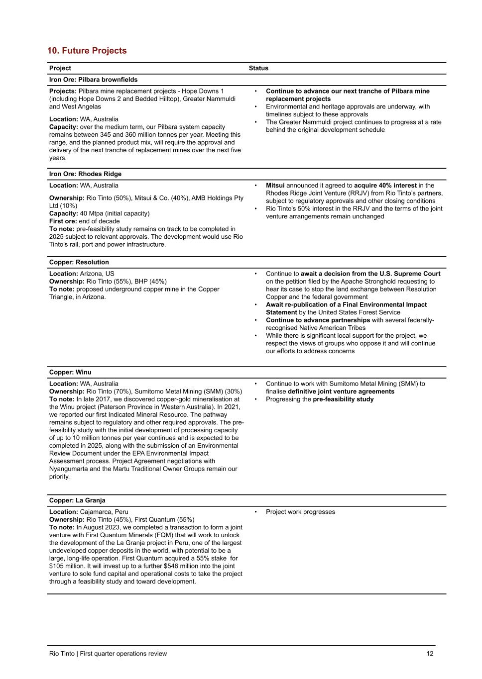 10. Future Projects Project Status Iron Ore: Pilbara brownfields Projects: Pilbara mine replacement projects - Hope Downs 1 (including Hope Downs 2 and Bedded Hilltop), Greater Nammuldi and West Angelas Location: WA, Australia Capacity: over the medium term, our Pilbara system capacity remains between 345 and 360 million tonnes per year. Meeting this range, and the planned product mix, will require the approval and delivery of the next tranche of replacement mines over the next five years. • Continue to advance our next tranche of Pilbara mine replacement projects • Environmental and heritage approvals are underway, with timelines subject to these approvals • The Greater Nammuldi project continues to progress at a rate behind the original development schedule Iron Ore: Rhodes Ridge Location: WA, Australia Ownership: Rio Tinto (50%), Mitsui & Co. (40%), AMB Holdings Pty Ltd (10%) Capacity: 40 Mtpa (initial capacity) First ore: end of decade To note: pre-feasibility study remains on track to be completed in 2025 subject to relevant approvals. The development would use Rio Tinto’s rail, port and power infrastructure. • Mitsui announced it agreed to acquire 40% interest in the Rhodes Ridge Joint Venture (RRJV) from Rio Tinto’s partners, subject to regulatory approvals and other closing conditions • Rio Tinto's 50% interest in the RRJV and the terms of the joint venture arrangements remain unchanged Copper: Resolution Location: Arizona, US Ownership: Rio Tinto (55%), BHP (45%) To note: proposed underground copper mine in the Copper Triangle, in Arizona. • Continue to await a decision from the U.S. Supreme Court on the petition filed by the Apache Stronghold requesting to hear its case to stop the land exchange between Resolution Copper and the federal government • Await re-publication of a Final Environmental Impact Statement by the United States Forest Service • Continue to advance partnerships with several federally- recognised Native American Tribes • While there is significant local support for the project, we respect the views of groups who oppose it and will continue our efforts to address concerns Copper: Winu Location: WA, Australia Ownership: Rio Tinto (70%), Sumitomo Metal Mining (SMM) (30%) To note: In late 2017, we discovered copper-gold mineralisation at the Winu project (Paterson Province in Western Australia). In 2021, we reported our first Indicated Mineral Resource. The pathway remains subject to regulatory and other required approvals. The pre- feasibility study with the initial development of processing capacity of up to 10 million tonnes per year continues and is expected to be completed in 2025, along with the submission of an Environmental Review Document under the EPA Environmental Impact Assessment process. Project Agreement negotiations with Nyangumarta and the Martu Traditional Owner Groups remain our priority. • Continue to work with Sumitomo Metal Mining (SMM) to finalise definitive joint venture agreements • Progressing the pre-feasibility study Copper: La Granja Location: Cajamarca, Peru Ownership: Rio Tinto (45%), First Quantum (55%) To note: In August 2023, we completed a transaction to form a joint venture with First Quantum Minerals (FQM) that will work to unlock the development of the La Granja project in Peru, one of the largest undeveloped copper deposits in the world, with potential to be a large, long-life operation. First Quantum acquired a 55% stake for $105 million. It will invest up to a further $546 million into the joint venture to sole fund capital and operational costs to take the project through a feasibility study and toward development. • Project work progresses Rio Tinto | First quarter operations review 12
