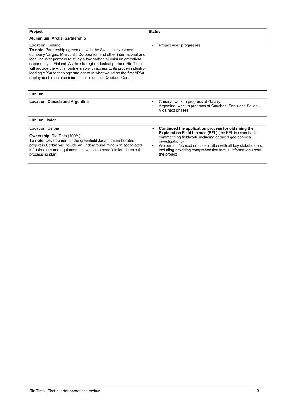 Project Status Aluminium: Arctial partnership Location: Finland To note: Partnership agreement with the Swedish investment company Vargas, Mitsubishi Corporation and other international and local industry partners to study a low carbon aluminium greenfield opportunity in Finland. As the strategic industrial partner, Rio Tinto will provide the Arctial partnership with access to its proven industry- leading AP60 technology and assist in what would be the first AP60 deployment in an aluminium smelter outside Quebec, Canada. • Project work progresses Lithium Location: Canada and Argentina • Canada: work in progress at Galaxy • Argentina: work in progress at Cauchari, Fenix and Sal de Vida next phases Lithium: Jadar Location: Serbia Ownership: Rio Tinto (100%) To note: Development of the greenfield Jadar lithium-borates project in Serbia will include an underground mine with associated infrastructure and equipment, as well as a beneficiation chemical processing plant. • Continued the application process for obtaining the Exploitation Field Licence (EFL) (the EFL is essential for commencing fieldwork, including detailed geotechnical investigations) • We remain focused on consultation with all key stakeholders, including providing comprehensive factual information about the project Rio Tinto | First quarter operations review 13