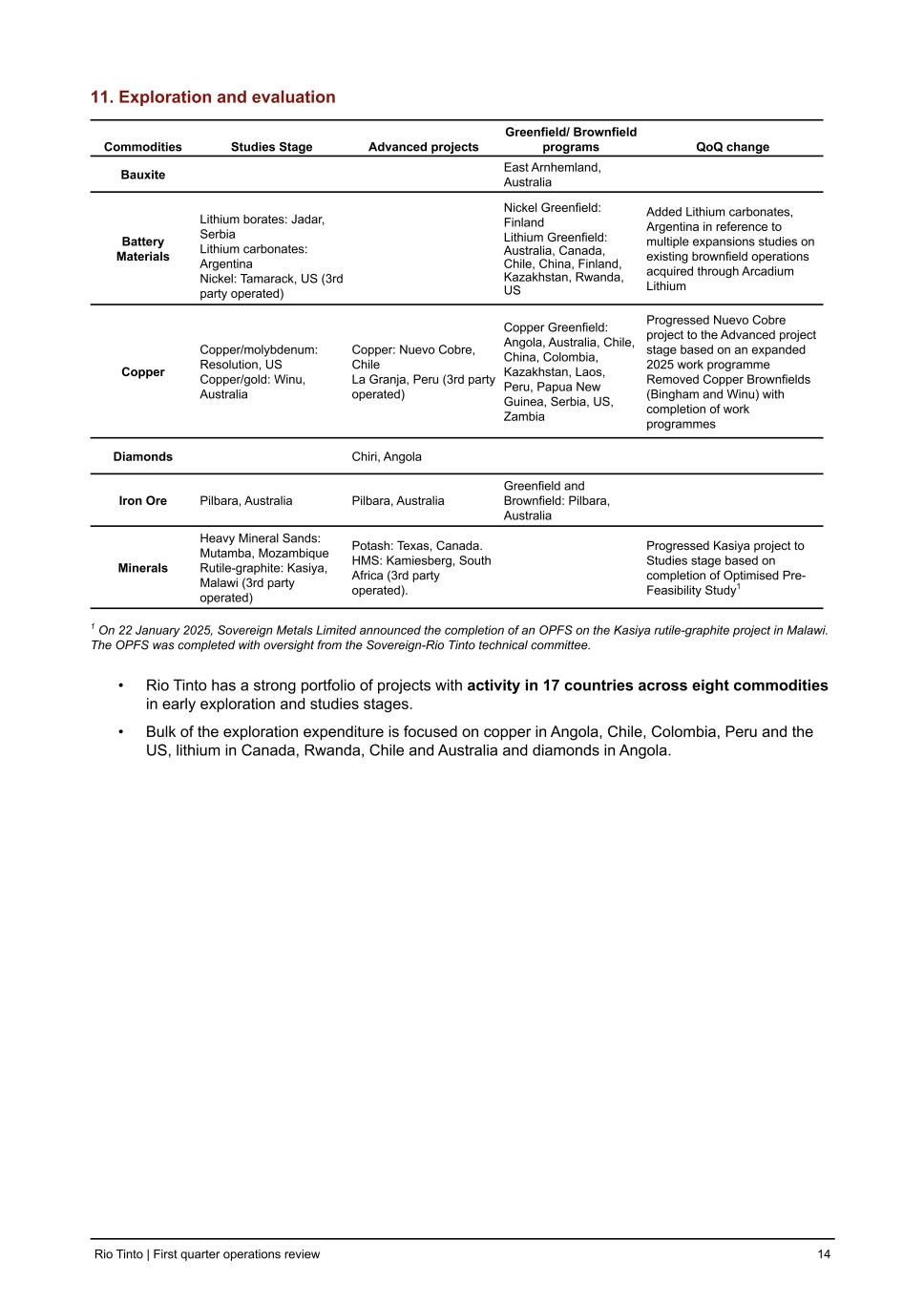 11. Exploration and evaluation Commodities Studies Stage Advanced projects Greenfield/ Brownfield programs QoQ change Bauxite East Arnhemland, Australia Battery Materials Lithium borates: Jadar, Serbia Lithium carbonates: Argentina Nickel: Tamarack, US (3rd party operated) Nickel Greenfield: Finland Lithium Greenfield: Australia, Canada, Chile, China, Finland, Kazakhstan, Rwanda, US Added Lithium carbonates, Argentina in reference to multiple expansions studies on existing brownfield operations acquired through Arcadium Lithium Copper Copper/molybdenum: Resolution, US Copper/gold: Winu, Australia Copper: Nuevo Cobre, Chile La Granja, Peru (3rd party operated) Copper Greenfield: Angola, Australia, Chile, China, Colombia, Kazakhstan, Laos, Peru, Papua New Guinea, Serbia, US, Zambia Progressed Nuevo Cobre project to the Advanced project stage based on an expanded 2025 work programme Removed Copper Brownfields (Bingham and Winu) with completion of work programmes Diamonds Chiri, Angola Iron Ore Pilbara, Australia Pilbara, Australia Greenfield and Brownfield: Pilbara, Australia Minerals Heavy Mineral Sands: Mutamba, Mozambique Rutile-graphite: Kasiya, Malawi (3rd party operated) Potash: Texas, Canada. HMS: Kamiesberg, South Africa (3rd party operated). Progressed Kasiya project to Studies stage based on completion of Optimised Pre- Feasibility Study1 1 On 22 January 2025, Sovereign Metals Limited announced the completion of an OPFS on the Kasiya rutile-graphite project in Malawi. The OPFS was completed with oversight from the Sovereign-Rio Tinto technical committee. • Rio Tinto has a strong portfolio of projects with activity in 17 countries across eight commodities in early exploration and studies stages. • Bulk of the exploration expenditure is focused on copper in Angola, Chile, Colombia, Peru and the US, lithium in Canada, Rwanda, Chile and Australia and diamonds in Angola. Rio Tinto | First quarter operations review 14
