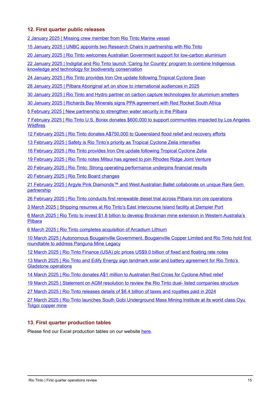 12. First quarter public releases 2 January 2025 | Missing crew member from Rio Tinto Marine vessel 15 January 2025 | UNBC appoints two Research Chairs in partnership with Rio Tinto 20 January 2025 | Rio Tinto welcomes Australian Government support for low-carbon aluminium 22 January 2025 | Indigital and Rio Tinto launch ‘Caring for Country’ program to combine Indigenous knowledge and technology for biodiversity conservation 24 January 2025 | Rio Tinto provides Iron Ore update following Tropical Cyclone Sean 28 January 2025 | Pilbara Aboriginal art on show to international audiences in 2025 30 January 2025 | Rio Tinto and Hydro partner on carbon capture technologies for aluminium smelters 30 January 2025 | Richards Bay Minerals signs PPA agreement with Red Rocket South Africa 5 February 2025 | New partnership to strengthen water security in the Pilbara 7 February 2025 | Rio Tinto U.S. Borax donates $600,000 to support communities impacted by Los Angeles Wildfires 12 February 2025 | Rio Tinto donates A$750,000 to Queensland flood relief and recovery efforts 13 February 2025 | Safety is Rio Tinto’s priority as Tropical Cyclone Zelia intensifies 16 February 2025 | Rio Tinto provides Iron Ore update following Tropical Cyclone Zelia 19 February 2025 | Rio Tinto notes Mitsui has agreed to join Rhodes Ridge Joint Venture 20 February 2025 | Rio Tinto: Strong operating performance underpins financial results 20 February 2025 | Rio Tinto Board changes 21 February 2025 | Argyle Pink Diamonds™ and West Australian Ballet collaborate on unique Rare Gem partnership 26 February 2025 | Rio Tinto conducts first renewable diesel trial across Pilbara iron ore operations 3 March 2025 | Shipping resumes at Rio Tinto’s East Intercourse Island facility at Dampier Port 6 March 2025 | Rio Tinto to invest $1.8 billion to develop Brockman mine extension in Western Australia’s Pilbara 6 March 2025 | Rio Tinto completes acquisition of Arcadium Lithium 10 March 2025 | Autonomous Bougainville Government, Bougainville Copper Limited and Rio Tinto hold first roundtable to address Panguna Mine Legacy 12 March 2025 | Rio Tinto Finance (USA) plc prices US$9.0 billion of fixed and floating rate notes 13 March 2025 | Rio Tinto and Edify Energy sign landmark solar and battery agreement for Rio Tinto’s Gladstone operations 14 March 2025 | Rio Tinto donates A$1 million to Australian Red Cross for Cyclone Alfred relief 19 March 2025 | Statement on AGM resolution to review the Rio Tinto dual- listed companies structure 27 March 2025 | Rio Tinto releases details of $8.4 billion of taxes and royalties paid in 2024 27 March 2025 | Rio Tinto launches South Gobi Underground Mass Mining Institute at its world class Oyu Tolgoi copper mine 13. First quarter production tables Please find our Excel production tables on our website here. Rio Tinto | First quarter operations review 15
