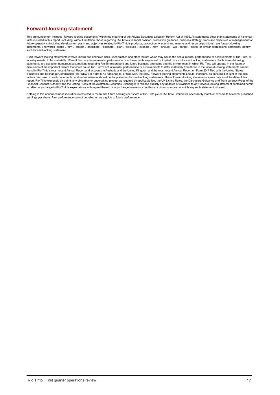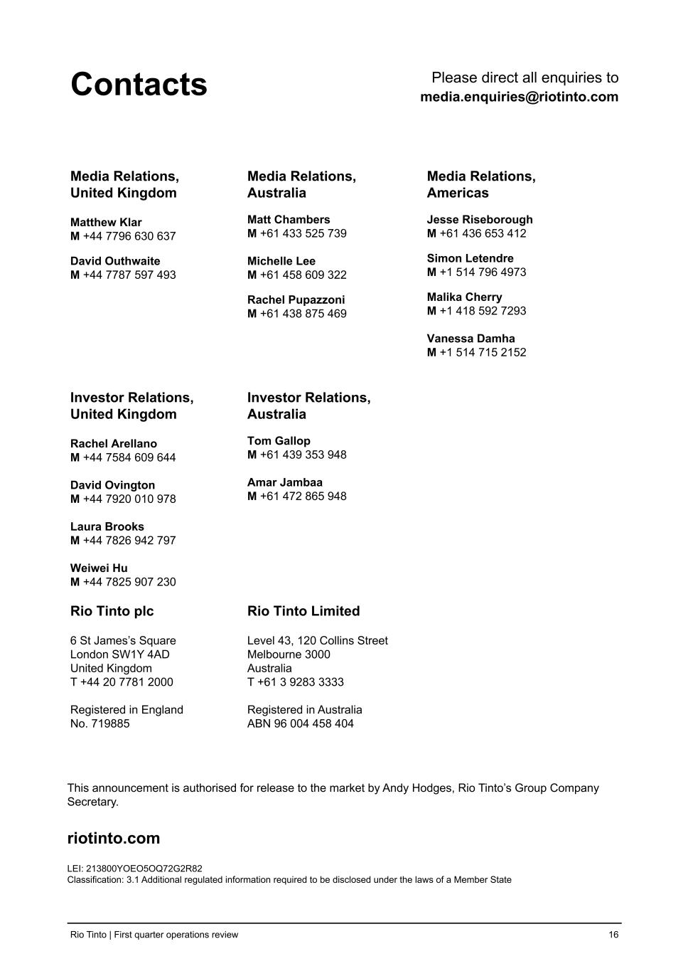 Contacts Please direct all enquiries to media.enquiries@riotinto.com Media Relations, United Kingdom Matthew Klar M +44 7796 630 637 David Outhwaite M +44 7787 597 493 Media Relations, Australia Matt Chambers M +61 433 525 739 Michelle Lee M +61 458 609 322 Rachel Pupazzoni M +61 438 875 469 Media Relations, Americas Jesse Riseborough M +61 436 653 412 Simon Letendre M +1 514 796 4973 Malika Cherry M +1 418 592 7293 Vanessa Damha M +1 514 715 2152 Investor Relations, United Kingdom Rachel Arellano M +44 7584 609 644 David Ovington M +44 7920 010 978 Laura Brooks M +44 7826 942 797 Weiwei Hu M +44 7825 907 230 Investor Relations, Australia Tom Gallop M +61 439 353 948 Amar Jambaa M +61 472 865 948 Rio Tinto plc 6 St James’s Square London SW1Y 4AD United Kingdom T +44 20 7781 2000 Registered in England No. 719885 Rio Tinto Limited Level 43, 120 Collins Street Melbourne 3000 Australia T +61 3 9283 3333 Registered in Australia ABN 96 004 458 404 This announcement is authorised for release to the market by Andy Hodges, Rio Tinto’s Group Company Secretary. riotinto.com LEI: 213800YOEO5OQ72G2R82 Classification: 3.1 Additional regulated information required to be disclosed under the laws of a Member State Rio Tinto | First quarter operations review 16