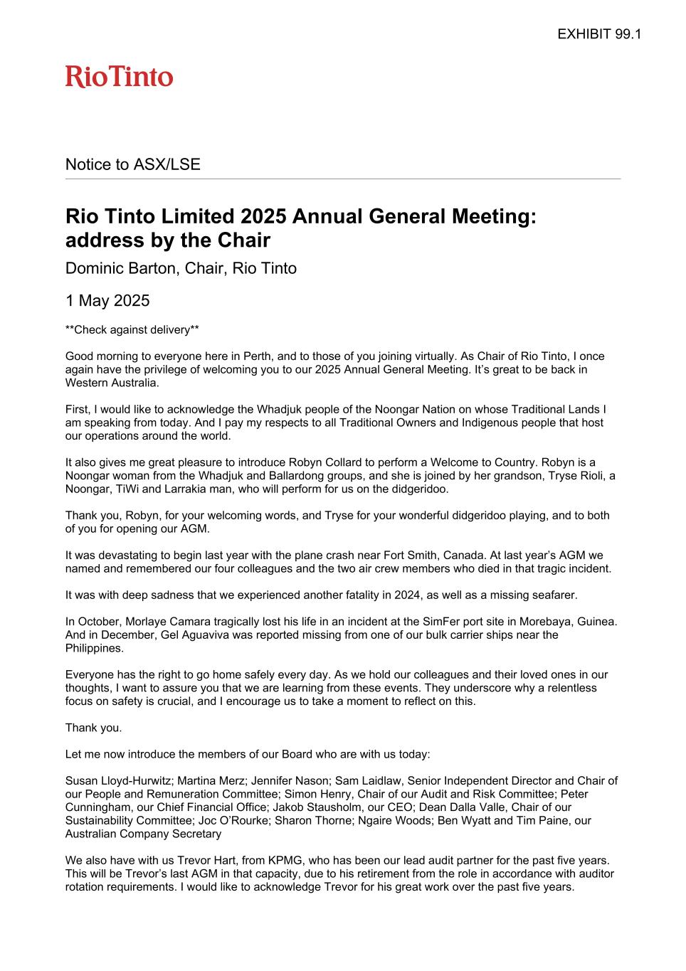 Notice to ASX/LSE Rio Tinto Limited 2025 Annual General Meeting: address by the Chair Dominic Barton, Chair, Rio Tinto 1 May 2025 **Check against delivery** Good morning to everyone here in Perth, and to those of you joining virtually. As Chair of Rio Tinto, I once again have the privilege of welcoming you to our 2025 Annual General Meeting. It’s great to be back in Western Australia. First, I would like to acknowledge the Whadjuk people of the Noongar Nation on whose Traditional Lands I am speaking from today. And I pay my respects to all Traditional Owners and Indigenous people that host our operations around the world. It also gives me great pleasure to introduce Robyn Collard to perform a Welcome to Country. Robyn is a Noongar woman from the Whadjuk and Ballardong groups, and she is joined by her grandson, Tryse Rioli, a Noongar, TiWi and Larrakia man, who will perform for us on the didgeridoo. Thank you, Robyn, for your welcoming words, and Tryse for your wonderful didgeridoo playing, and to both of you for opening our AGM. It was devastating to begin last year with the plane crash near Fort Smith, Canada. At last year’s AGM we named and remembered our four colleagues and the two air crew members who died in that tragic incident. It was with deep sadness that we experienced another fatality in 2024, as well as a missing seafarer. In October, Morlaye Camara tragically lost his life in an incident at the SimFer port site in Morebaya, Guinea. And in December, Gel Aguaviva was reported missing from one of our bulk carrier ships near the Philippines. Everyone has the right to go home safely every day. As we hold our colleagues and their loved ones in our thoughts, I want to assure you that we are learning from these events. They underscore why a relentless focus on safety is crucial, and I encourage us to take a moment to reflect on this. Thank you. Let me now introduce the members of our Board who are with us today: Susan Lloyd-Hurwitz; Martina Merz; Jennifer Nason; Sam Laidlaw, Senior Independent Director and Chair of our People and Remuneration Committee; Simon Henry, Chair of our Audit and Risk Committee; Peter Cunningham, our Chief Financial Office; Jakob Stausholm, our CEO; Dean Dalla Valle, Chair of our Sustainability Committee; Joc O’Rourke; Sharon Thorne; Ngaire Woods; Ben Wyatt and Tim Paine, our Australian Company Secretary We also have with us Trevor Hart, from KPMG, who has been our lead audit partner for the past five years. This will be Trevor’s last AGM in that capacity, due to his retirement from the role in accordance with auditor rotation requirements. I would like to acknowledge Trevor for his great work over the past five years. EXHIBIT 99.1