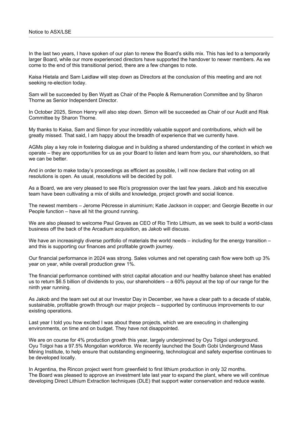 Notice to ASX/LSE In the last two years, I have spoken of our plan to renew the Board’s skills mix. This has led to a temporarily larger Board, while our more experienced directors have supported the handover to newer members. As we come to the end of this transitional period, there are a few changes to note. Kaisa Hietala and Sam Laidlaw will step down as Directors at the conclusion of this meeting and are not seeking re-election today. Sam will be succeeded by Ben Wyatt as Chair of the People & Remuneration Committee and by Sharon Thorne as Senior Independent Director. In October 2025, Simon Henry will also step down. Simon will be succeeded as Chair of our Audit and Risk Committee by Sharon Thorne. My thanks to Kaisa, Sam and Simon for your incredibly valuable support and contributions, which will be greatly missed. That said, I am happy about the breadth of experience that we currently have. AGMs play a key role in fostering dialogue and in building a shared understanding of the context in which we operate – they are opportunities for us as your Board to listen and learn from you, our shareholders, so that we can be better. And in order to make today’s proceedings as efficient as possible, I will now declare that voting on all resolutions is open. As usual, resolutions will be decided by poll. As a Board, we are very pleased to see Rio’s progression over the last few years. Jakob and his executive team have been cultivating a mix of skills and knowledge, project growth and social licence. The newest members – Jerome Pécresse in aluminium; Katie Jackson in copper; and Georgie Bezette in our People function – have all hit the ground running. We are also pleased to welcome Paul Graves as CEO of Rio Tinto Lithium, as we seek to build a world-class business off the back of the Arcadium acquisition, as Jakob will discuss. We have an increasingly diverse portfolio of materials the world needs – including for the energy transition – and this is supporting our finances and profitable growth journey. Our financial performance in 2024 was strong. Sales volumes and net operating cash flow were both up 3% year on year, while overall production grew 1%. The financial performance combined with strict capital allocation and our healthy balance sheet has enabled us to return $6.5 billion of dividends to you, our shareholders – a 60% payout at the top of our range for the ninth year running. As Jakob and the team set out at our Investor Day in December, we have a clear path to a decade of stable, sustainable, profitable growth through our major projects – supported by continuous improvements to our existing operations. Last year I told you how excited I was about these projects, which we are executing in challenging environments, on time and on budget. They have not disappointed. We are on course for 4% production growth this year, largely underpinned by Oyu Tolgoi underground. Oyu Tolgoi has a 97.5% Mongolian workforce. We recently launched the South Gobi Underground Mass Mining Institute, to help ensure that outstanding engineering, technological and safety expertise continues to be developed locally. In Argentina, the Rincon project went from greenfield to first lithium production in only 32 months. The Board was pleased to approve an investment late last year to expand the plant, where we will continue developing Direct Lithium Extraction techniques (DLE) that support water conservation and reduce waste.