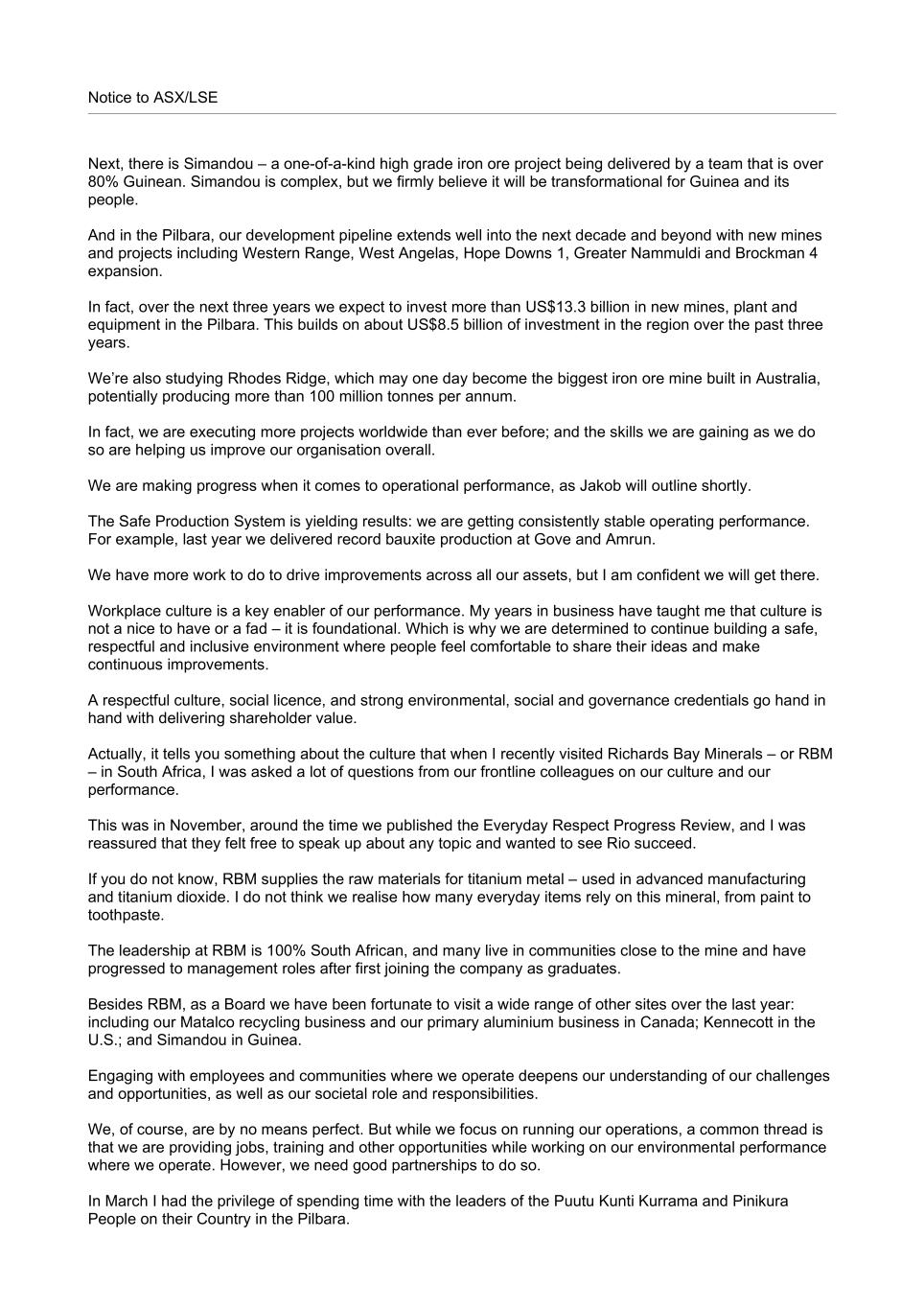 Notice to ASX/LSE Next, there is Simandou – a one-of-a-kind high grade iron ore project being delivered by a team that is over 80% Guinean. Simandou is complex, but we firmly believe it will be transformational for Guinea and its people. And in the Pilbara, our development pipeline extends well into the next decade and beyond with new mines and projects including Western Range, West Angelas, Hope Downs 1, Greater Nammuldi and Brockman 4 expansion. In fact, over the next three years we expect to invest more than US$13.3 billion in new mines, plant and equipment in the Pilbara. This builds on about US$8.5 billion of investment in the region over the past three years. We’re also studying Rhodes Ridge, which may one day become the biggest iron ore mine built in Australia, potentially producing more than 100 million tonnes per annum. In fact, we are executing more projects worldwide than ever before; and the skills we are gaining as we do so are helping us improve our organisation overall. We are making progress when it comes to operational performance, as Jakob will outline shortly. The Safe Production System is yielding results: we are getting consistently stable operating performance. For example, last year we delivered record bauxite production at Gove and Amrun. We have more work to do to drive improvements across all our assets, but I am confident we will get there. Workplace culture is a key enabler of our performance. My years in business have taught me that culture is not a nice to have or a fad – it is foundational. Which is why we are determined to continue building a safe, respectful and inclusive environment where people feel comfortable to share their ideas and make continuous improvements. A respectful culture, social licence, and strong environmental, social and governance credentials go hand in hand with delivering shareholder value. Actually, it tells you something about the culture that when I recently visited Richards Bay Minerals – or RBM – in South Africa, I was asked a lot of questions from our frontline colleagues on our culture and our performance. This was in November, around the time we published the Everyday Respect Progress Review, and I was reassured that they felt free to speak up about any topic and wanted to see Rio succeed. If you do not know, RBM supplies the raw materials for titanium metal – used in advanced manufacturing and titanium dioxide. I do not think we realise how many everyday items rely on this mineral, from paint to toothpaste. The leadership at RBM is 100% South African, and many live in communities close to the mine and have progressed to management roles after first joining the company as graduates. Besides RBM, as a Board we have been fortunate to visit a wide range of other sites over the last year: including our Matalco recycling business and our primary aluminium business in Canada; Kennecott in the U.S.; and Simandou in Guinea. Engaging with employees and communities where we operate deepens our understanding of our challenges and opportunities, as well as our societal role and responsibilities. We, of course, are by no means perfect. But while we focus on running our operations, a common thread is that we are providing jobs, training and other opportunities while working on our environmental performance where we operate. However, we need good partnerships to do so. In March I had the privilege of spending time with the leaders of the Puutu Kunti Kurrama and Pinikura People on their Country in the Pilbara.