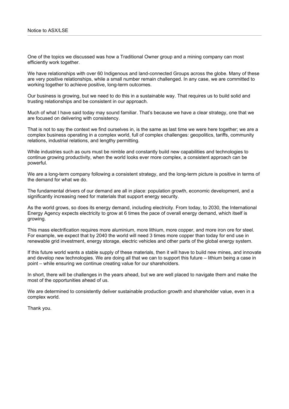 Notice to ASX/LSE One of the topics we discussed was how a Traditional Owner group and a mining company can most efficiently work together. We have relationships with over 60 Indigenous and land-connected Groups across the globe. Many of these are very positive relationships, while a small number remain challenged. In any case, we are committed to working together to achieve positive, long-term outcomes. Our business is growing, but we need to do this in a sustainable way. That requires us to build solid and trusting relationships and be consistent in our approach. Much of what I have said today may sound familiar. That’s because we have a clear strategy, one that we are focused on delivering with consistency. That is not to say the context we find ourselves in, is the same as last time we were here together; we are a complex business operating in a complex world, full of complex challenges: geopolitics, tariffs, community relations, industrial relations, and lengthy permitting. While industries such as ours must be nimble and constantly build new capabilities and technologies to continue growing productivity, when the world looks ever more complex, a consistent approach can be powerful. We are a long-term company following a consistent strategy, and the long-term picture is positive in terms of the demand for what we do. The fundamental drivers of our demand are all in place: population growth, economic development, and a significantly increasing need for materials that support energy security. As the world grows, so does its energy demand, including electricity. From today, to 2030, the International Energy Agency expects electricity to grow at 6 times the pace of overall energy demand, which itself is growing. This mass electrification requires more aluminium, more lithium, more copper, and more iron ore for steel. For example, we expect that by 2040 the world will need 3 times more copper than today for end use in renewable grid investment, energy storage, electric vehicles and other parts of the global energy system. If this future world wants a stable supply of these materials, then it will have to build new mines, and innovate and develop new technologies. We are doing all that we can to support this future – lithium being a case in point – while ensuring we continue creating value for our shareholders. In short, there will be challenges in the years ahead, but we are well placed to navigate them and make the most of the opportunities ahead of us. We are determined to consistently deliver sustainable production growth and shareholder value, even in a complex world. Thank you.