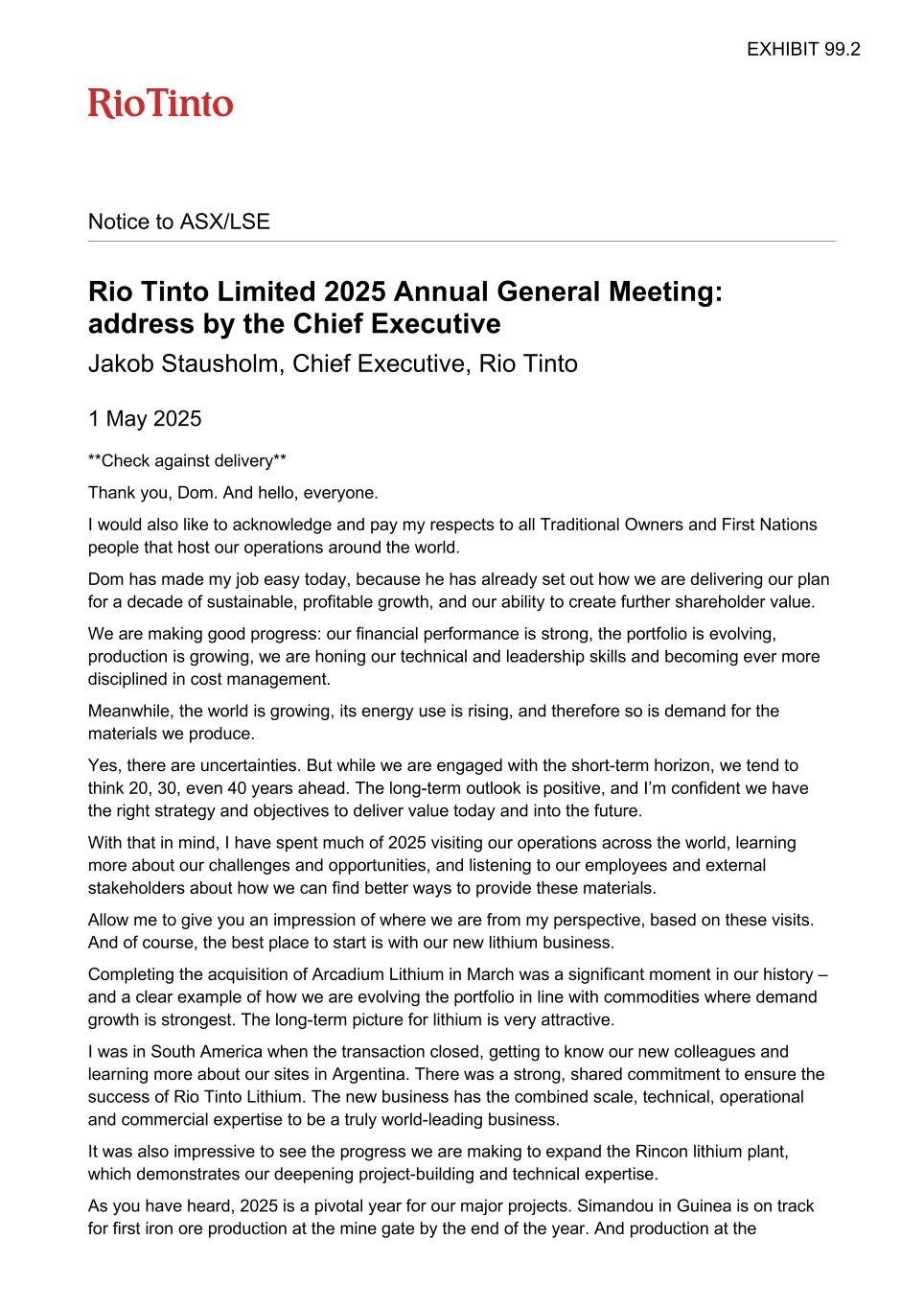Notice to ASX/LSE Rio Tinto Limited 2025 Annual General Meeting: address by the Chief Executive Jakob Stausholm, Chief Executive, Rio Tinto 1 May 2025 **Check against delivery** Thank you, Dom. And hello, everyone. I would also like to acknowledge and pay my respects to all Traditional Owners and First Nations people that host our operations around the world. Dom has made my job easy today, because he has already set out how we are delivering our plan for a decade of sustainable, profitable growth, and our ability to create further shareholder value. We are making good progress: our financial performance is strong, the portfolio is evolving, production is growing, we are honing our technical and leadership skills and becoming ever more disciplined in cost management. Meanwhile, the world is growing, its energy use is rising, and therefore so is demand for the materials we produce. Yes, there are uncertainties. But while we are engaged with the short-term horizon, we tend to think 20, 30, even 40 years ahead. The long-term outlook is positive, and I’m confident we have the right strategy and objectives to deliver value today and into the future. With that in mind, I have spent much of 2025 visiting our operations across the world, learning more about our challenges and opportunities, and listening to our employees and external stakeholders about how we can find better ways to provide these materials. Allow me to give you an impression of where we are from my perspective, based on these visits. And of course, the best place to start is with our new lithium business. Completing the acquisition of Arcadium Lithium in March was a significant moment in our history – and a clear example of how we are evolving the portfolio in line with commodities where demand growth is strongest. The long-term picture for lithium is very attractive. I was in South America when the transaction closed, getting to know our new colleagues and learning more about our sites in Argentina. There was a strong, shared commitment to ensure the success of Rio Tinto Lithium. The new business has the combined scale, technical, operational and commercial expertise to be a truly world-leading business. It was also impressive to see the progress we are making to expand the Rincon lithium plant, which demonstrates our deepening project-building and technical expertise. As you have heard, 2025 is a pivotal year for our major projects. Simandou in Guinea is on track for first iron ore production at the mine gate by the end of the year. And production at the EXHIBIT 99.2