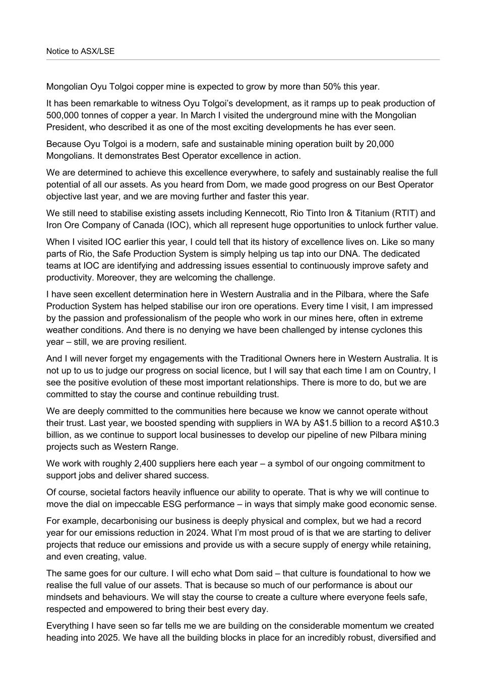 Notice to ASX/LSE Mongolian Oyu Tolgoi copper mine is expected to grow by more than 50% this year. It has been remarkable to witness Oyu Tolgoi’s development, as it ramps up to peak production of 500,000 tonnes of copper a year. In March I visited the underground mine with the Mongolian President, who described it as one of the most exciting developments he has ever seen. Because Oyu Tolgoi is a modern, safe and sustainable mining operation built by 20,000 Mongolians. It demonstrates Best Operator excellence in action. We are determined to achieve this excellence everywhere, to safely and sustainably realise the full potential of all our assets. As you heard from Dom, we made good progress on our Best Operator objective last year, and we are moving further and faster this year. We still need to stabilise existing assets including Kennecott, Rio Tinto Iron & Titanium (RTIT) and Iron Ore Company of Canada (IOC), which all represent huge opportunities to unlock further value. When I visited IOC earlier this year, I could tell that its history of excellence lives on. Like so many parts of Rio, the Safe Production System is simply helping us tap into our DNA. The dedicated teams at IOC are identifying and addressing issues essential to continuously improve safety and productivity. Moreover, they are welcoming the challenge. I have seen excellent determination here in Western Australia and in the Pilbara, where the Safe Production System has helped stabilise our iron ore operations. Every time I visit, I am impressed by the passion and professionalism of the people who work in our mines here, often in extreme weather conditions. And there is no denying we have been challenged by intense cyclones this year – still, we are proving resilient. And I will never forget my engagements with the Traditional Owners here in Western Australia. It is not up to us to judge our progress on social licence, but I will say that each time I am on Country, I see the positive evolution of these most important relationships. There is more to do, but we are committed to stay the course and continue rebuilding trust. We are deeply committed to the communities here because we know we cannot operate without their trust. Last year, we boosted spending with suppliers in WA by A$1.5 billion to a record A$10.3 billion, as we continue to support local businesses to develop our pipeline of new Pilbara mining projects such as Western Range. We work with roughly 2,400 suppliers here each year – a symbol of our ongoing commitment to support jobs and deliver shared success. Of course, societal factors heavily influence our ability to operate. That is why we will continue to move the dial on impeccable ESG performance – in ways that simply make good economic sense. For example, decarbonising our business is deeply physical and complex, but we had a record year for our emissions reduction in 2024. What I’m most proud of is that we are starting to deliver projects that reduce our emissions and provide us with a secure supply of energy while retaining, and even creating, value. The same goes for our culture. I will echo what Dom said – that culture is foundational to how we realise the full value of our assets. That is because so much of our performance is about our mindsets and behaviours. We will stay the course to create a culture where everyone feels safe, respected and empowered to bring their best every day. Everything I have seen so far tells me we are building on the considerable momentum we created heading into 2025. We have all the building blocks in place for an incredibly robust, diversified and