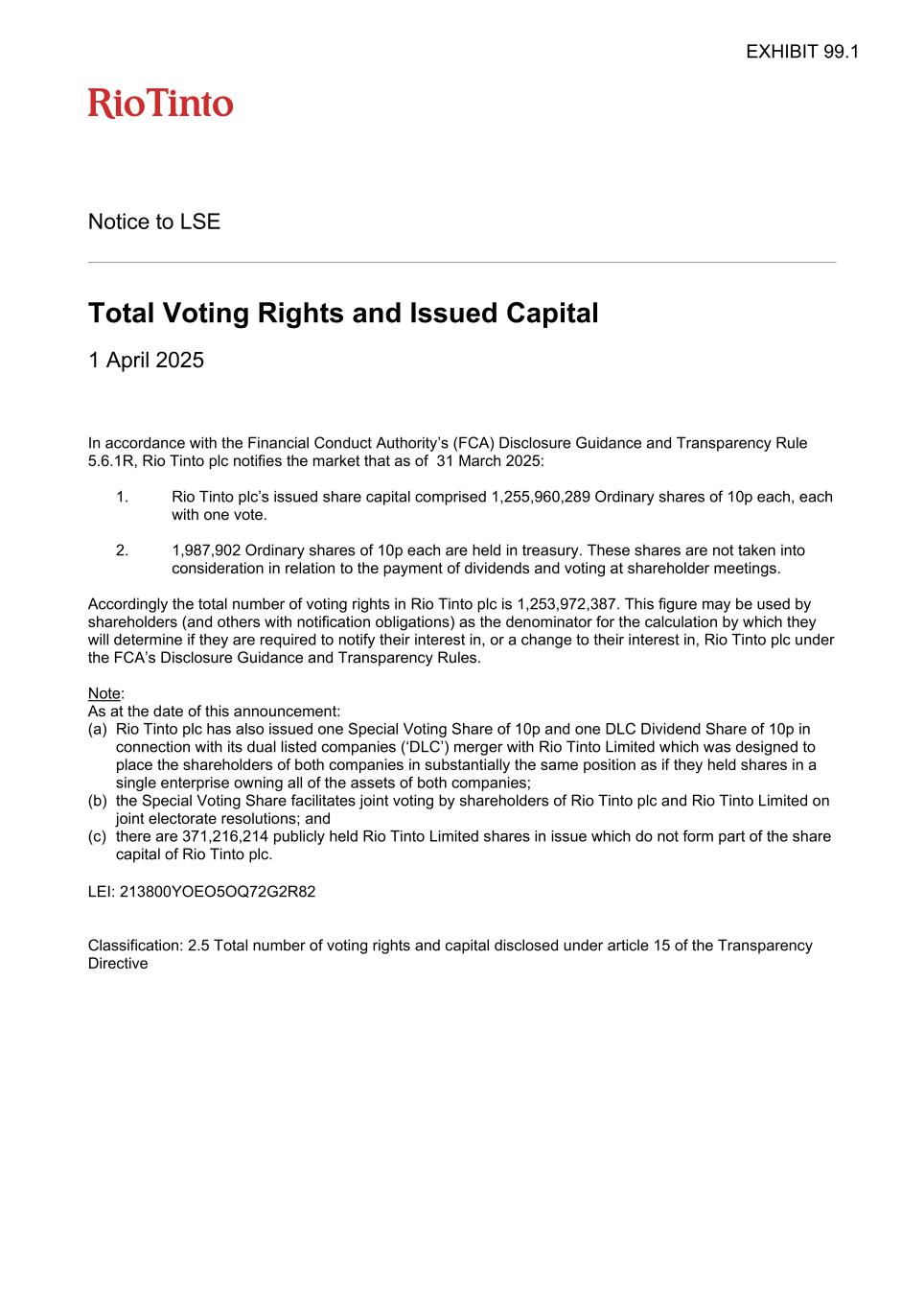 Notice to LSE Total Voting Rights and Issued Capital 1 April 2025 In accordance with the Financial Conduct Authority’s (FCA) Disclosure Guidance and Transparency Rule 5.6.1R, Rio Tinto plc notifies the market that as of 31 March 2025: 1. Rio Tinto plc’s issued share capital comprised 1,255,960,289 Ordinary shares of 10p each, each with one vote. 2. 1,987,902 Ordinary shares of 10p each are held in treasury. These shares are not taken into consideration in relation to the payment of dividends and voting at shareholder meetings. Accordingly the total number of voting rights in Rio Tinto plc is 1,253,972,387. This figure may be used by shareholders (and others with notification obligations) as the denominator for the calculation by which they will determine if they are required to notify their interest in, or a change to their interest in, Rio Tinto plc under the FCA’s Disclosure Guidance and Transparency Rules. Note: As at the date of this announcement: (a) Rio Tinto plc has also issued one Special Voting Share of 10p and one DLC Dividend Share of 10p in connection with its dual listed companies (‘DLC’) merger with Rio Tinto Limited which was designed to place the shareholders of both companies in substantially the same position as if they held shares in a single enterprise owning all of the assets of both companies; (b) the Special Voting Share facilitates joint voting by shareholders of Rio Tinto plc and Rio Tinto Limited on joint electorate resolutions; and (c) there are 371,216,214 publicly held Rio Tinto Limited shares in issue which do not form part of the share capital of Rio Tinto plc. LEI: 213800YOEO5OQ72G2R82 Classification: 2.5 Total number of voting rights and capital disclosed under article 15 of the Transparency Directive EXHIBIT 99.1