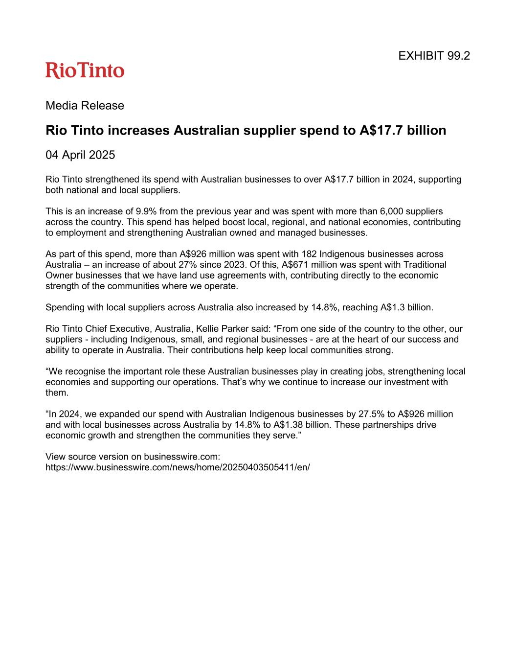 EXHIBIT 99.2 Media Release Rio Tinto increases Australian supplier spend to A$17.7 billion 04 April 2025 Rio Tinto strengthened its spend with Australian businesses to over A$17.7 billion in 2024, supporting both national and local suppliers. This is an increase of 9.9% from the previous year and was spent with more than 6,000 suppliers across the country. This spend has helped boost local, regional, and national economies, contributing to employment and strengthening Australian owned and managed businesses. As part of this spend, more than A$926 million was spent with 182 Indigenous businesses across Australia – an increase of about 27% since 2023. Of this, A$671 million was spent with Traditional Owner businesses that we have land use agreements with, contributing directly to the economic strength of the communities where we operate. Spending with local suppliers across Australia also increased by 14.8%, reaching A$1.3 billion. Rio Tinto Chief Executive, Australia, Kellie Parker said: “From one side of the country to the other, our suppliers - including Indigenous, small, and regional businesses - are at the heart of our success and ability to operate in Australia. Their contributions help keep local communities strong. “We recognise the important role these Australian businesses play in creating jobs, strengthening local economies and supporting our operations. That’s why we continue to increase our investment with them. “In 2024, we expanded our spend with Australian Indigenous businesses by 27.5% to A$926 million and with local businesses across Australia by 14.8% to A$1.38 billion. These partnerships drive economic growth and strengthen the communities they serve.” View source version on businesswire.com: https://www.businesswire.com/news/home/20250403505411/en/