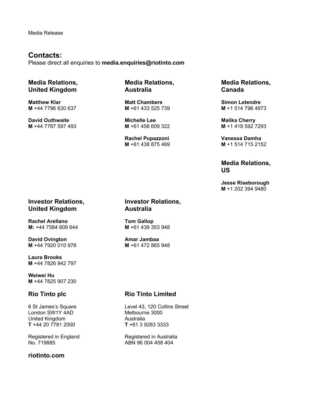 Media Release Contacts: Please direct all enquiries to media.enquiries@riotinto.com Media Relations, United Kingdom Matthew Klar M +44 7796 630 637 David Outhwaite M +44 7787 597 493 Media Relations, Australia Matt Chambers M +61 433 525 739 Michelle Lee M +61 458 609 322 Rachel Pupazzoni M +61 438 875 469 Media Relations, Canada Simon Letendre M +1 514 796 4973 Malika Cherry M +1 418 592 7293 Vanessa Damha M +1 514 715 2152 Media Relations, US Jesse Riseborough M +1 202 394 9480 Investor Relations, United Kingdom Rachel Arellano M: +44 7584 609 644 David Ovington M +44 7920 010 978 Laura Brooks M +44 7826 942 797 Weiwei Hu M +44 7825 907 230 Investor Relations, Australia Tom Gallop M +61 439 353 948 Amar Jambaa M +61 472 865 948 Rio Tinto plc 6 St James’s Square London SW1Y 4AD United Kingdom T +44 20 7781 2000 Registered in England No. 719885 Rio Tinto Limited Level 43, 120 Collins Street Melbourne 3000 Australia T +61 3 9283 3333 Registered in Australia ABN 96 004 458 404 riotinto.com