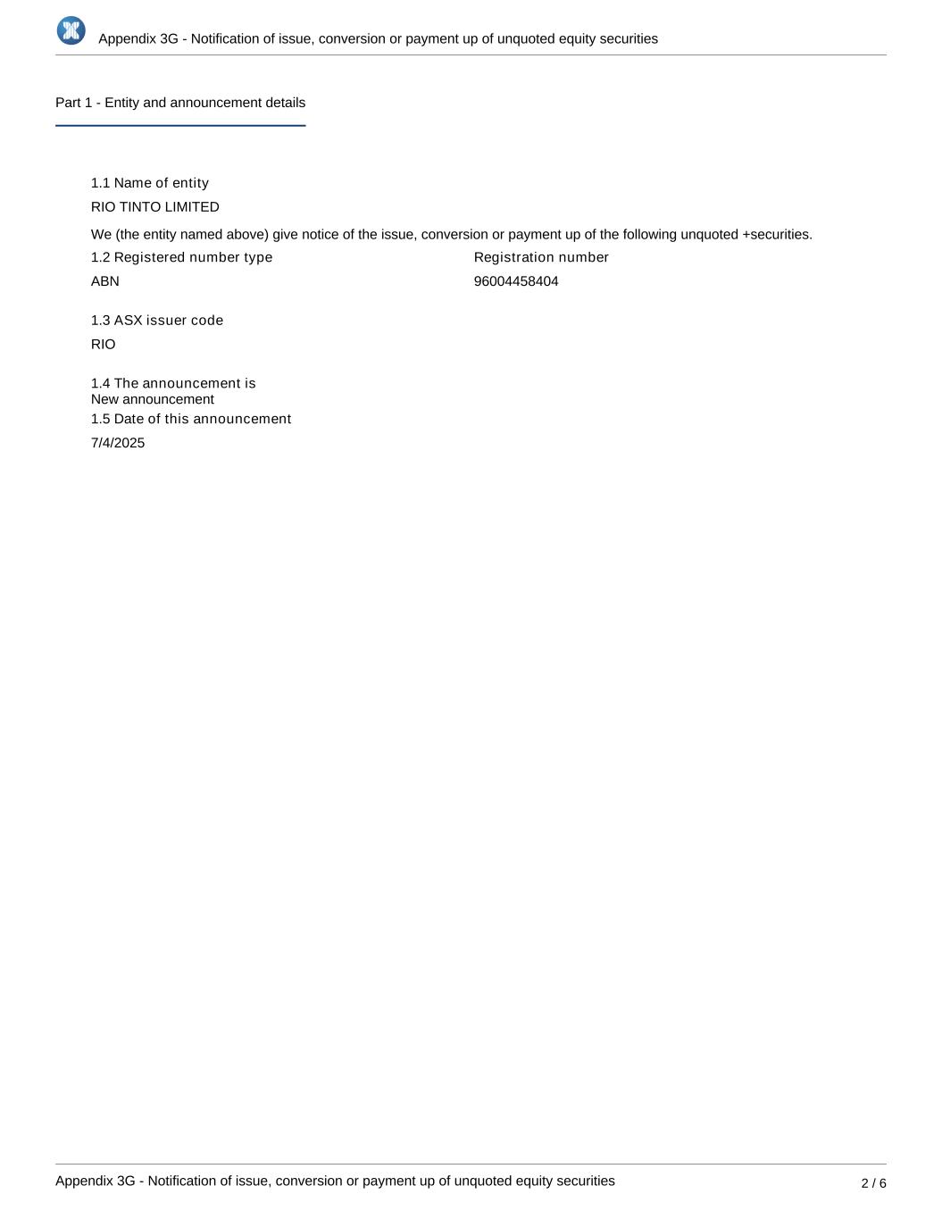 Appendix 3G - Notification of issue, conversion or payment up of unquoted equity securities Appendix 3G - Notification of issue, conversion or payment up of unquoted equity securities 2 / 6 Part 1 - Entity and announcement details 1.1 Name of entity RIO TINTO LIMITED We (the entity named above) give notice of the issue, conversion or payment up of the following unquoted +securities. 1.2 Registered number type ABN Registration number 96004458404 1.3 ASX issuer code RIO 1.4 The announcement is 1.5 Date of this announcement 7/4/2025 New announcement