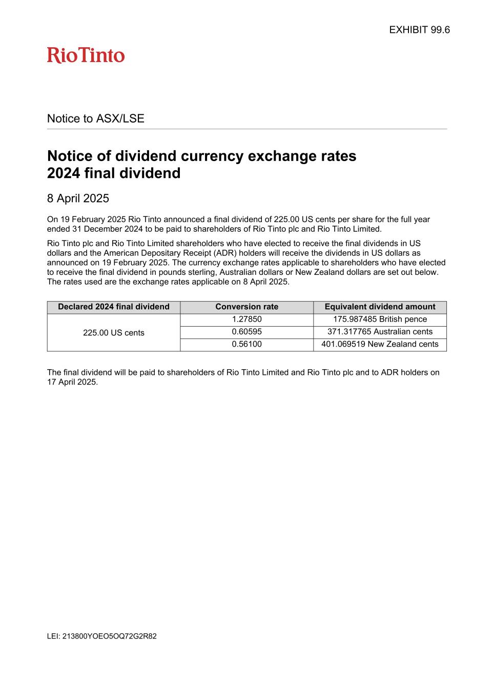 Notice to ASX/LSE Notice of dividend currency exchange rates 2024 final dividend 8 April 2025 On 19 February 2025 Rio Tinto announced a final dividend of 225.00 US cents per share for the full year ended 31 December 2024 to be paid to shareholders of Rio Tinto plc and Rio Tinto Limited. Rio Tinto plc and Rio Tinto Limited shareholders who have elected to receive the final dividends in US dollars and the American Depositary Receipt (ADR) holders will receive the dividends in US dollars as announced on 19 February 2025. The currency exchange rates applicable to shareholders who have elected to receive the final dividend in pounds sterling, Australian dollars or New Zealand dollars are set out below. The rates used are the exchange rates applicable on 8 April 2025. Declared 2024 final dividend Conversion rate Equivalent dividend amount 225.00 US cents 1.27850 175.987485 British pence 0.60595 371.317765 Australian cents 0.56100 401.069519 New Zealand cents The final dividend will be paid to shareholders of Rio Tinto Limited and Rio Tinto plc and to ADR holders on 17 April 2025. LEI: 213800YOEO5OQ72G2R82 EXHIBIT 99.6