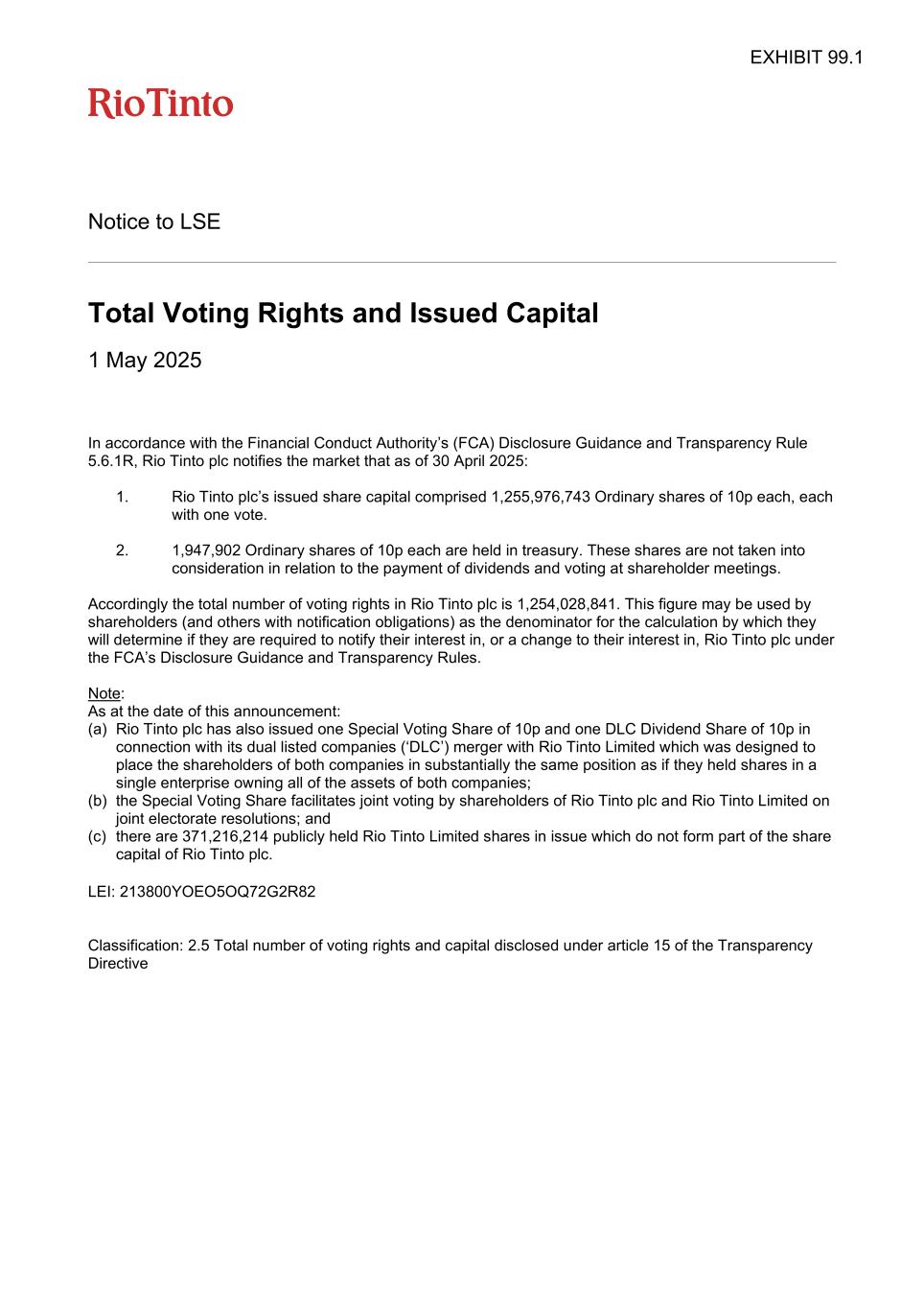 Notice to LSE Total Voting Rights and Issued Capital 1 May 2025 In accordance with the Financial Conduct Authority’s (FCA) Disclosure Guidance and Transparency Rule 5.6.1R, Rio Tinto plc notifies the market that as of 30 April 2025: 1. Rio Tinto plc’s issued share capital comprised 1,255,976,743 Ordinary shares of 10p each, each with one vote. 2. 1,947,902 Ordinary shares of 10p each are held in treasury. These shares are not taken into consideration in relation to the payment of dividends and voting at shareholder meetings. Accordingly the total number of voting rights in Rio Tinto plc is 1,254,028,841. This figure may be used by shareholders (and others with notification obligations) as the denominator for the calculation by which they will determine if they are required to notify their interest in, or a change to their interest in, Rio Tinto plc under the FCA’s Disclosure Guidance and Transparency Rules. Note: As at the date of this announcement: (a) Rio Tinto plc has also issued one Special Voting Share of 10p and one DLC Dividend Share of 10p in connection with its dual listed companies (‘DLC’) merger with Rio Tinto Limited which was designed to place the shareholders of both companies in substantially the same position as if they held shares in a single enterprise owning all of the assets of both companies; (b) the Special Voting Share facilitates joint voting by shareholders of Rio Tinto plc and Rio Tinto Limited on joint electorate resolutions; and (c) there are 371,216,214 publicly held Rio Tinto Limited shares in issue which do not form part of the share capital of Rio Tinto plc. LEI: 213800YOEO5OQ72G2R82 Classification: 2.5 Total number of voting rights and capital disclosed under article 15 of the Transparency Directive EXHIBIT 99.1