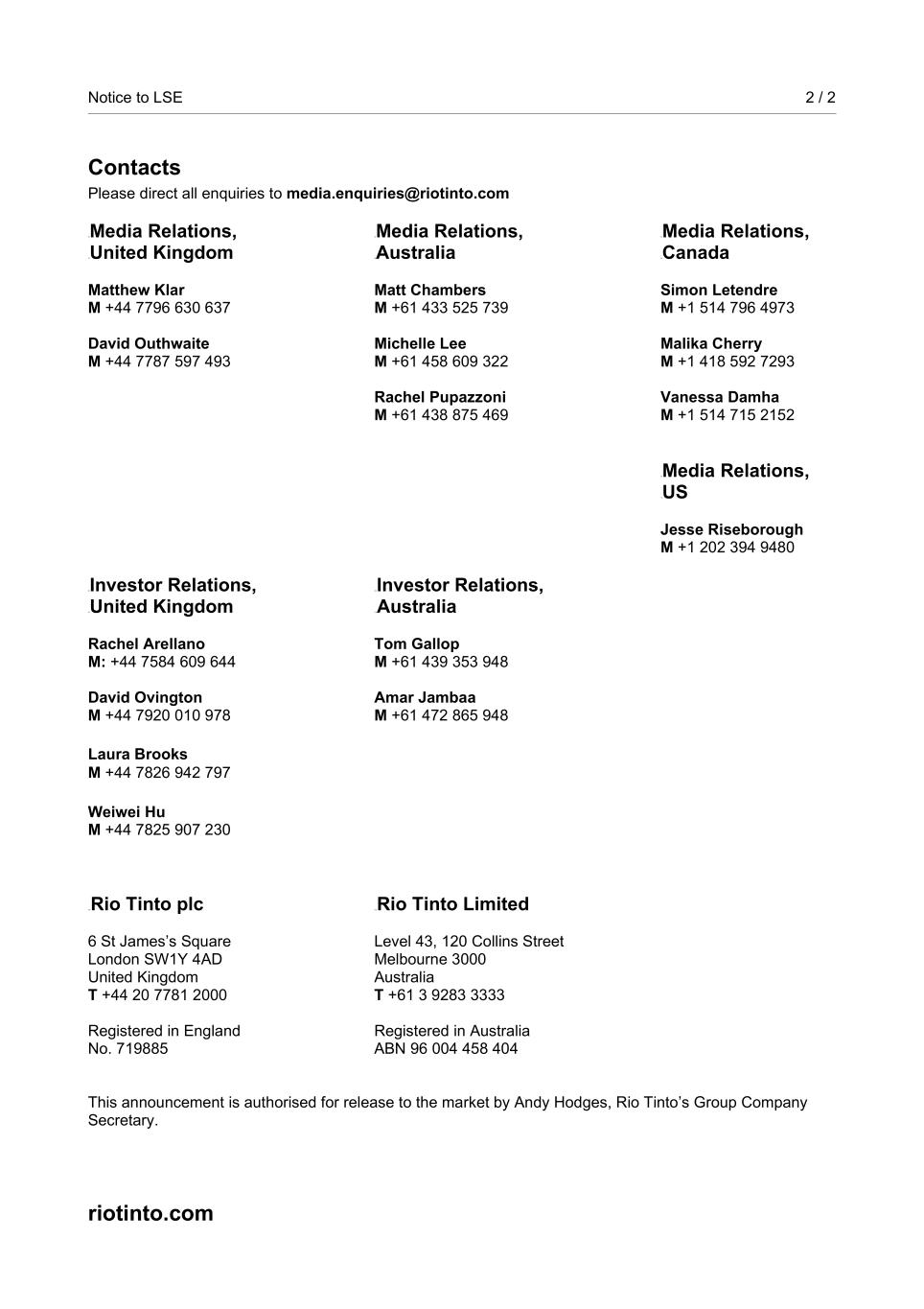 Notice to LSE 2 / 2 Contacts Please direct all enquiries to media.enquiries@riotinto.com 0BMedia Relations, 1BUnited Kingdom Matthew Klar M +44 7796 630 637 David Outhwaite M +44 7787 597 493 2BMedia Relations, 3BAustralia Matt Chambers M +61 433 525 739 Michelle Lee M +61 458 609 322 Rachel Pupazzoni M +61 438 875 469 4BMedia Relations, 5BCanada Simon Letendre M +1 514 796 4973 Malika Cherry M +1 418 592 7293 Vanessa Damha M +1 514 715 2152 6BMedia Relations, 7BUS Jesse Riseborough M +1 202 394 9480 8BInvestor Relations, 9BUnited Kingdom Rachel Arellano M: +44 7584 609 644 David Ovington M +44 7920 010 978 Laura Brooks M +44 7826 942 797 Weiwei Hu M +44 7825 907 230 10BInvestor Relations, 11BAustralia Tom Gallop M +61 439 353 948 Amar Jambaa M +61 472 865 948 12BRio Tinto plc 6 St James’s Square London SW1Y 4AD United Kingdom T +44 20 7781 2000 Registered in England No. 719885 13BRio Tinto Limited Level 43, 120 Collins Street Melbourne 3000 Australia T +61 3 9283 3333 Registered in Australia ABN 96 004 458 404 This announcement is authorised for release to the market by Andy Hodges, Rio Tinto’s Group Company Secretary. riotinto.com