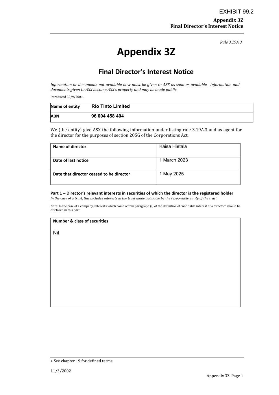 Appendix 3Z Final Director’s Interest Notice + See chapter 19 for defined terms. 11/3/2002 Appendix 3Z Page 1 Rule 3.19A.3 Appendix 3Z Final Director’s Interest Notice Information or documents not available now must be given to ASX as soon as available. Information and documents given to ASX become ASX’s property and may be made public. Introduced 30/9/2001. Name of entity Rio Tinto Limited ABN 96 004 458 404 We (the entity) give ASX the following information under listing rule 3.19A.3 and as agent for the director for the purposes of section 205G of the Corporations Act. Name of director Kaisa Hietala Date of last notice 1 March 2023 Date that director ceased to be director 1 May 2025 Part 1 – Director’s relevant interests in securities of which the director is the registered holder In the case of a trust, this includes interests in the trust made available by the responsible entity of the trust Note: In the case of a company, interests which come within paragraph (i) of the definition of “notifiable interest of a director” should be disclosed in this part. Number & class of securities Nil EXHIBIT 99.2
