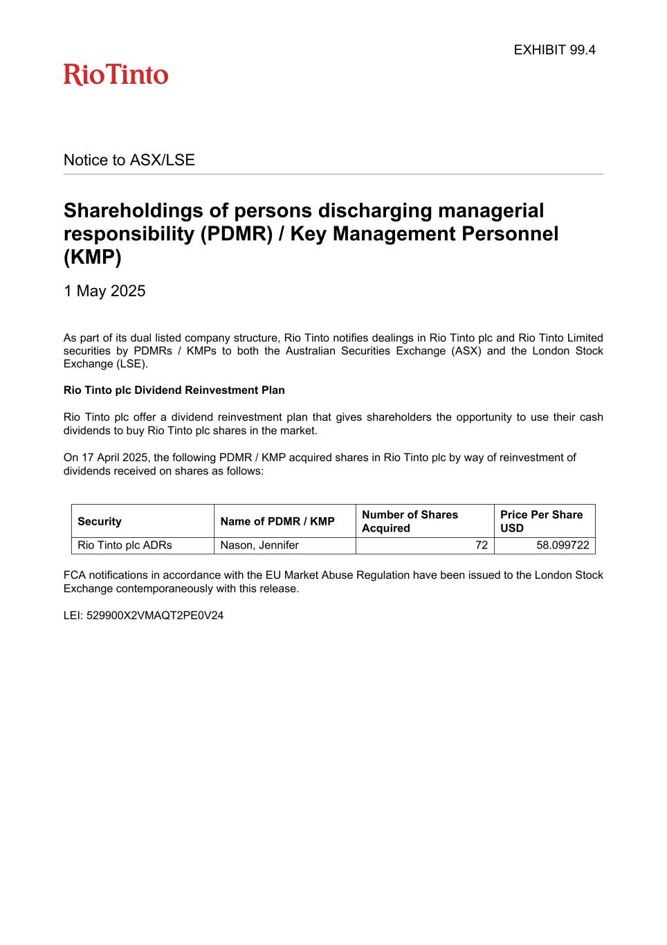 Notice to ASX/LSE Shareholdings of persons discharging managerial responsibility (PDMR) / Key Management Personnel (KMP) 1 May 2025 As part of its dual listed company structure, Rio Tinto notifies dealings in Rio Tinto plc and Rio Tinto Limited securities by PDMRs / KMPs to both the Australian Securities Exchange (ASX) and the London Stock Exchange (LSE). Rio Tinto plc Dividend Reinvestment Plan Rio Tinto plc offer a dividend reinvestment plan that gives shareholders the opportunity to use their cash dividends to buy Rio Tinto plc shares in the market. On 17 April 2025, the following PDMR / KMP acquired shares in Rio Tinto plc by way of reinvestment of dividends received on shares as follows: Security Name of PDMR / KMP Number of Shares Acquired Price Per Share USD Rio Tinto plc ADRs Nason, Jennifer 72 58.099722 FCA notifications in accordance with the EU Market Abuse Regulation have been issued to the London Stock Exchange contemporaneously with this release. LEI: 529900X2VMAQT2PE0V24 EXHIBIT 99.4