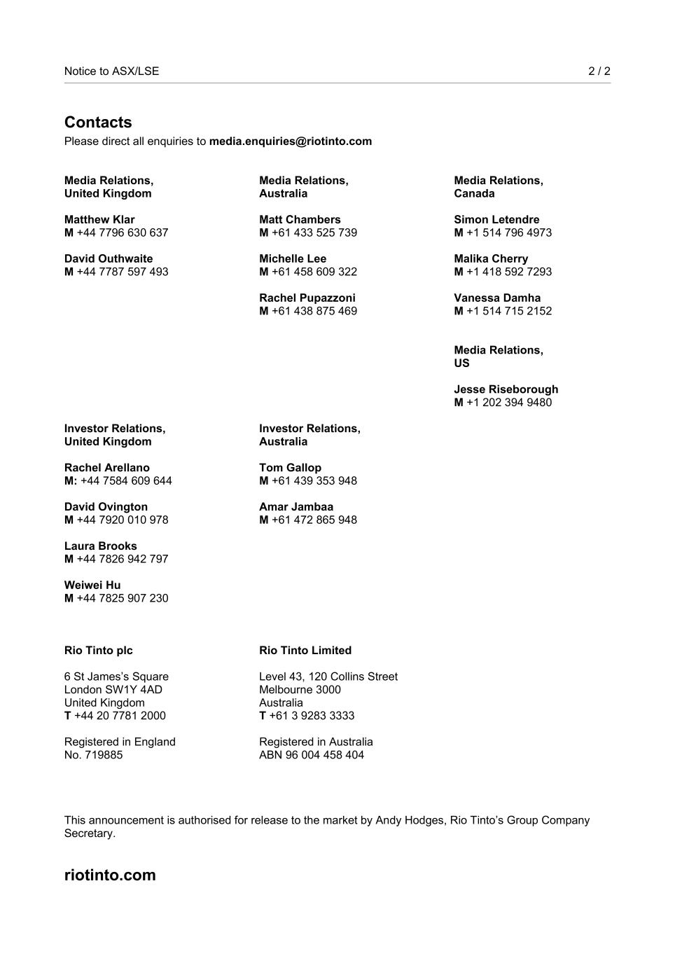 Notice to ASX/LSE 2 / 2 Contacts Please direct all enquiries to media.enquiries@riotinto.com Media Relations, United Kingdom Matthew Klar M +44 7796 630 637 David Outhwaite M +44 7787 597 493 Media Relations, Australia Matt Chambers M +61 433 525 739 Michelle Lee M +61 458 609 322 Rachel Pupazzoni M +61 438 875 469 Media Relations, Canada Simon Letendre M +1 514 796 4973 Malika Cherry M +1 418 592 7293 Vanessa Damha M +1 514 715 2152 Media Relations, US Jesse Riseborough M +1 202 394 9480 Investor Relations, United Kingdom Rachel Arellano M: +44 7584 609 644 David Ovington M +44 7920 010 978 Laura Brooks M +44 7826 942 797 Weiwei Hu M +44 7825 907 230 Investor Relations, Australia Tom Gallop M +61 439 353 948 Amar Jambaa M +61 472 865 948 Rio Tinto plc 6 St James’s Square London SW1Y 4AD United Kingdom T +44 20 7781 2000 Registered in England No. 719885 Rio Tinto Limited Level 43, 120 Collins Street Melbourne 3000 Australia T +61 3 9283 3333 Registered in Australia ABN 96 004 458 404 This announcement is authorised for release to the market by Andy Hodges, Rio Tinto’s Group Company Secretary. riotinto.com