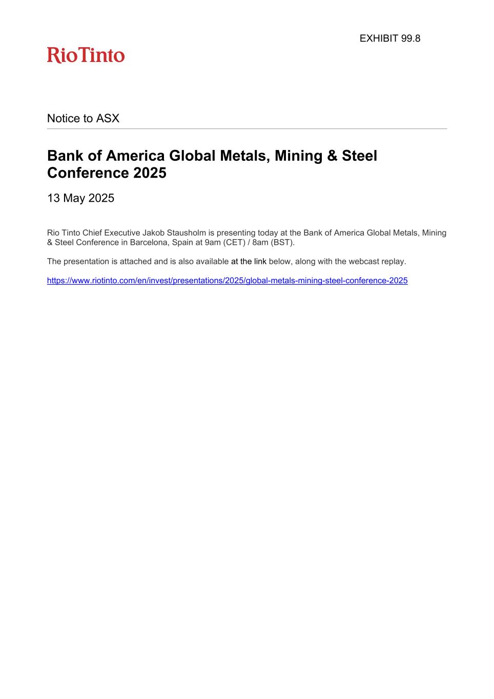 Notice to ASX Bank of America Global Metals, Mining & Steel Conference 2025 13 May 2025 Rio Tinto Chief Executive Jakob Stausholm is presenting today at the Bank of America Global Metals, Mining & Steel Conference in Barcelona, Spain at 9am (CET) / 8am (BST). The presentation is attached and is also available at the link below, along with the webcast replay. https://www.riotinto.com/en/invest/presentations/2025/global-metals-mining-steel-conference-2025 EXHIBIT 99.8