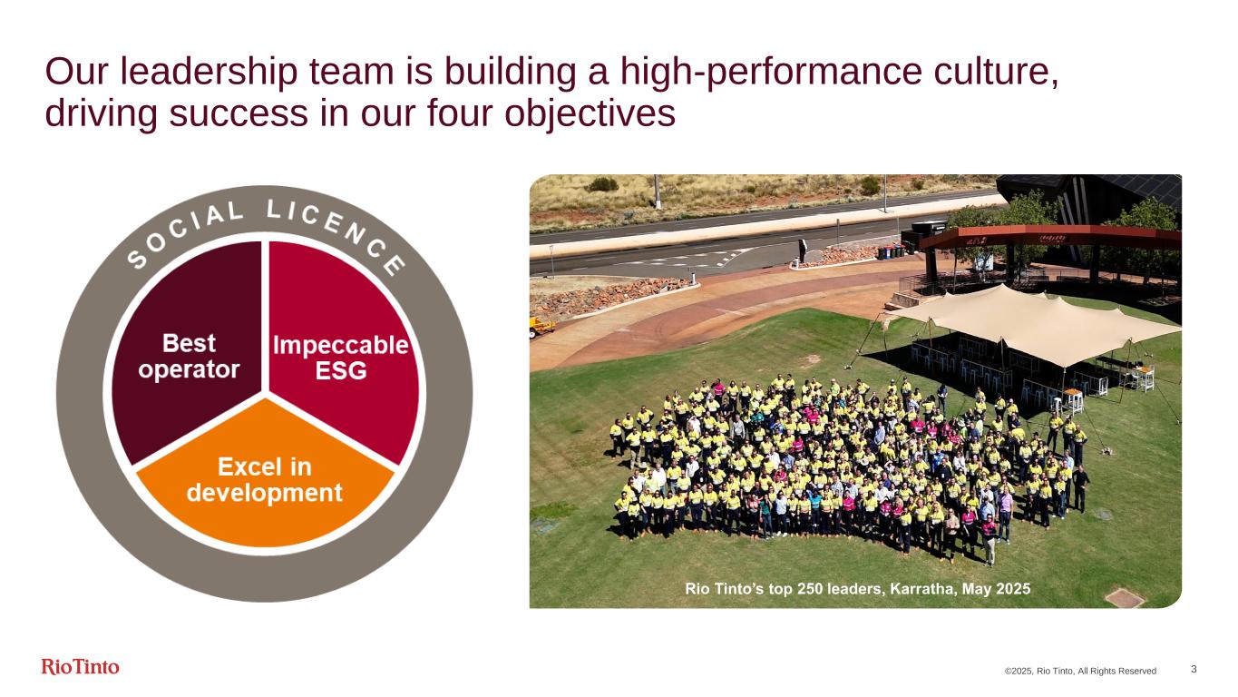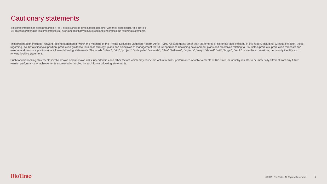 ©2025, Rio Tinto, All Rights Reserved 2 Cautionary statements This presentation has been prepared by Rio Tinto plc and Rio Tinto Limited (together with their subsidiaries,“Rio Tinto”). By accessing/attending this presentation you acknowledge that you have read and understood the following statements. This presentation includes “forward-looking statements” within the meaning of the Private Securities Litigation Reform Act of 1995. All statements other than statements of historical facts included in this report, including, without limitation, those regarding Rio Tinto’s financial position, production guidance, business strategy, plans and objectives of management for future operations (including development plans and objectives relating to Rio Tinto’s products, production forecasts and reserve and resource positions), are forward-looking statements. The words “intend”, “aim”, “project”, “anticipate”, “estimate”, “plan”, “believes”, “expects”, “may”, “should”, “will”, “target”, “set to” or similar expressions, commonly identify such forward-looking statement. Such forward-looking statements involve known and unknown risks, uncertainties and other factors which may cause the actual results, performance or achievements of Rio Tinto, or industry results, to be materially different from any future results, performance or achievements expressed or implied by such forward-looking statements.