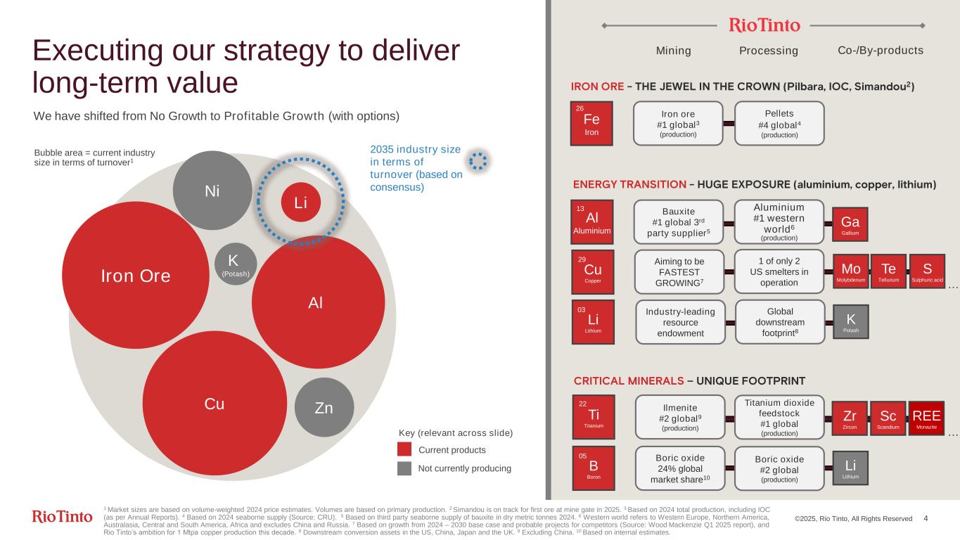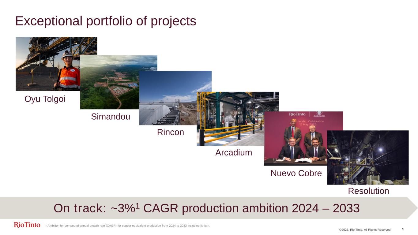©2025, Rio Tinto, All Rights Reserved 4 Executing our strategy to deliver long-term value Al Cu Zn Ni K (Potash) Li Iron Ore Current products Not currently producing 2035 industry size in terms of turnover (based on consensus) Fe Iron 26 Cu Copper 29 B Boron 05 Li Lithium 03 Ti Titanium 22 Iron ore #1 global3 (production) Bauxite #1 global 3rd party supplier5 Aiming to be FASTEST GROWING7 Ilmenite #2 global9 (production) Boric oxide 24% global market share10 Industry-leading resource endowment Aluminium #1 western world6 (production) Al Aluminium 13 Mining Processing Co-/By-products 1 of only 2 US smelters in operation Zr Zircon Mo Molybdenum Ga Gallium S Sulphuric acid K Potash Global downstream footprint8 Titanium dioxide feedstock #1 global (production) Boric oxide #2 global (production) Li Lithium Sc Scandium REE Monazite Te Tellurium Pellets #4 global4 (production) … … 1 Market sizes are based on volume-weighted 2024 price estimates. Volumes are based on primary production. 2 Simandou is on track for first ore at mine gate in 2025. 3 Based on 2024 total production, including IOC (as per Annual Reports). 4 Based on 2024 seaborne supply (Source: CRU). 5 Based on third party seaborne supply of bauxite in dry metric tonnes 2024. 6 Western world refers to Western Europe, Northern America, Australasia, Central and South America, Africa and excludes China and Russia. 7 Based on growth from 2024 – 2030 base case and probable projects for competitors (Source: Wood Mackenzie Q1 2025 report), and Rio Tinto’s ambition for 1 Mtpa copper production this decade. 8 Downstream conversion assets in the US, China, Japan and the UK. 9 Excluding China. 10 Based on internal estimates. We have shifted from No Growth to Profitable Growth (with options) Bubble area = current industry size in terms of turnover1 Key (relevant across slide)