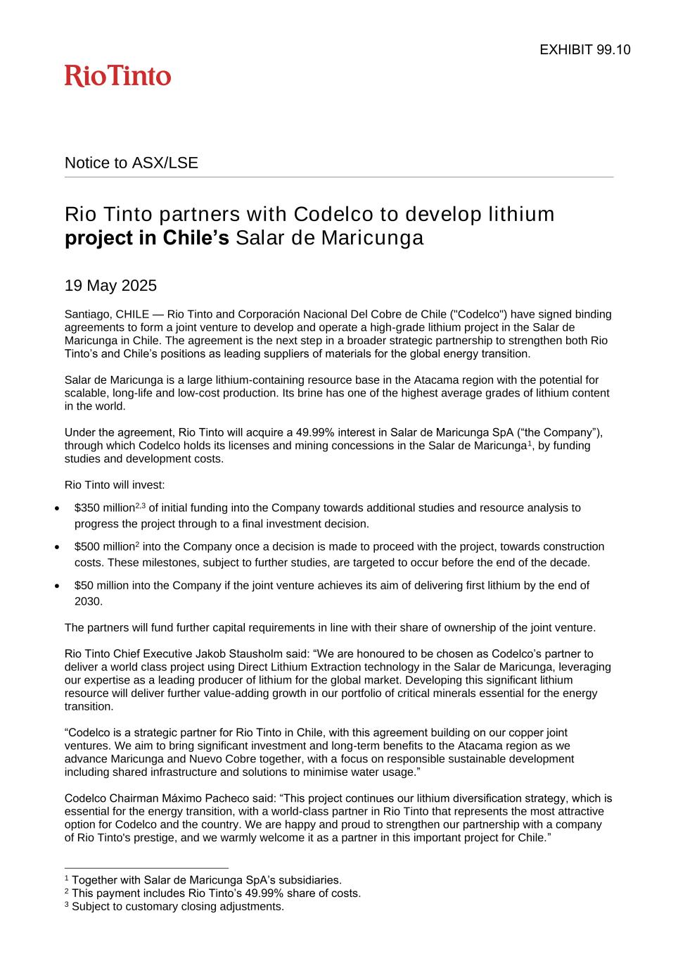 Notice to ASX/LSE Rio Tinto partners with Codelco to develop lithium project in Chile’s Salar de Maricunga 19 May 2025 Santiago, CHILE — Rio Tinto and Corporación Nacional Del Cobre de Chile ("Codelco") have signed binding agreements to form a joint venture to develop and operate a high-grade lithium project in the Salar de Maricunga in Chile. The agreement is the next step in a broader strategic partnership to strengthen both Rio Tinto’s and Chile’s positions as leading suppliers of materials for the global energy transition. Salar de Maricunga is a large lithium-containing resource base in the Atacama region with the potential for scalable, long-life and low-cost production. Its brine has one of the highest average grades of lithium content in the world. Under the agreement, Rio Tinto will acquire a 49.99% interest in Salar de Maricunga SpA (“the Company”), through which Codelco holds its licenses and mining concessions in the Salar de Maricunga1, by funding studies and development costs. Rio Tinto will invest: • $350 million2,3 of initial funding into the Company towards additional studies and resource analysis to progress the project through to a final investment decision. • $500 million2 into the Company once a decision is made to proceed with the project, towards construction costs. These milestones, subject to further studies, are targeted to occur before the end of the decade. • $50 million into the Company if the joint venture achieves its aim of delivering first lithium by the end of 2030. The partners will fund further capital requirements in line with their share of ownership of the joint venture. Rio Tinto Chief Executive Jakob Stausholm said: “We are honoured to be chosen as Codelco’s partner to deliver a world class project using Direct Lithium Extraction technology in the Salar de Maricunga, leveraging our expertise as a leading producer of lithium for the global market. Developing this significant lithium resource will deliver further value-adding growth in our portfolio of critical minerals essential for the energy transition. “Codelco is a strategic partner for Rio Tinto in Chile, with this agreement building on our copper joint ventures. We aim to bring significant investment and long-term benefits to the Atacama region as we advance Maricunga and Nuevo Cobre together, with a focus on responsible sustainable development including shared infrastructure and solutions to minimise water usage.” Codelco Chairman Máximo Pacheco said: “This project continues our lithium diversification strategy, which is essential for the energy transition, with a world-class partner in Rio Tinto that represents the most attractive option for Codelco and the country. We are happy and proud to strengthen our partnership with a company of Rio Tinto's prestige, and we warmly welcome it as a partner in this important project for Chile.” 1 Together with Salar de Maricunga SpA’s subsidiaries. 2 This payment includes Rio Tinto’s 49.99% share of costs. 3 Subject to customary closing adjustments. EXHIBIT 99.10