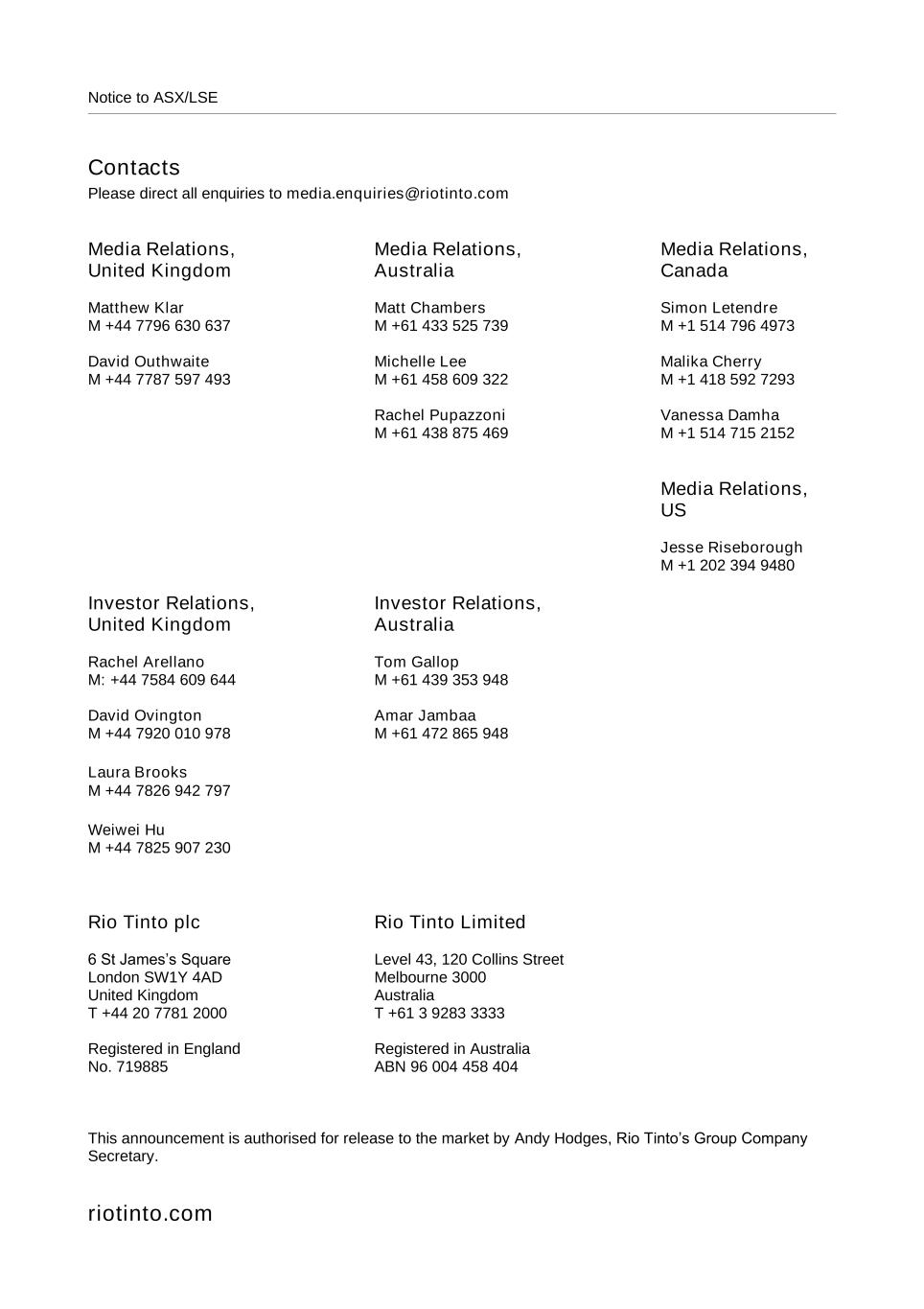 Notice to ASX/LSE Contacts Please direct all enquiries to media.enquiries@riotinto.com Media Relations, United Kingdom Matthew Klar M +44 7796 630 637 David Outhwaite M +44 7787 597 493 Media Relations, Australia Matt Chambers M +61 433 525 739 Michelle Lee M +61 458 609 322 Rachel Pupazzoni M +61 438 875 469 Media Relations, Canada Simon Letendre M +1 514 796 4973 Malika Cherry M +1 418 592 7293 Vanessa Damha M +1 514 715 2152 Media Relations, US Jesse Riseborough M +1 202 394 9480 Investor Relations, United Kingdom Rachel Arellano M: +44 7584 609 644 David Ovington M +44 7920 010 978 Laura Brooks M +44 7826 942 797 Weiwei Hu M +44 7825 907 230 Investor Relations, Australia Tom Gallop M +61 439 353 948 Amar Jambaa M +61 472 865 948 Rio Tinto plc 6 St James’s Square London SW1Y 4AD United Kingdom T +44 20 7781 2000 Registered in England No. 719885 Rio Tinto Limited Level 43, 120 Collins Street Melbourne 3000 Australia T +61 3 9283 3333 Registered in Australia ABN 96 004 458 404 This announcement is authorised for release to the market by Andy Hodges, Rio Tinto’s Group Company Secretary. riotinto.com