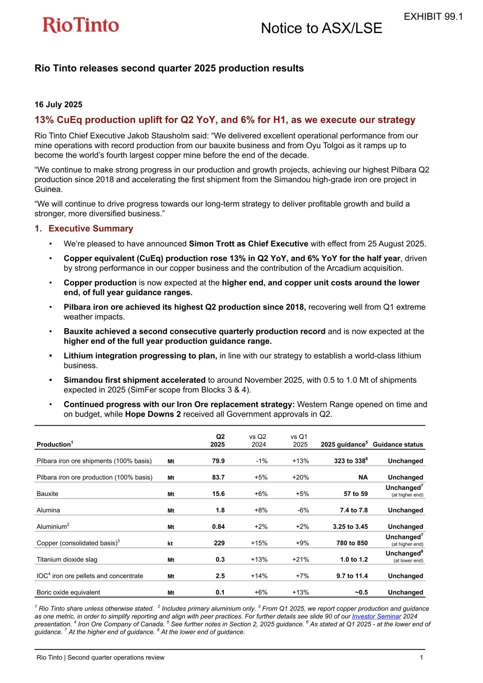 Rio Tinto releases second quarter 2025 production results 16 July 2025 13% CuEq production uplift for Q2 YoY, and 6% for H1, as we execute our strategy Rio Tinto Chief Executive Jakob Stausholm said: “We delivered excellent operational performance from our mine operations with record production from our bauxite business and from Oyu Tolgoi as it ramps up to become the world’s fourth largest copper mine before the end of the decade. “We continue to make strong progress in our production and growth projects, achieving our highest Pilbara Q2 production since 2018 and accelerating the first shipment from the Simandou high-grade iron ore project in Guinea. “We will continue to drive progress towards our long-term strategy to deliver profitable growth and build a stronger, more diversified business.” 1. Executive Summary • We’re pleased to have announced Simon Trott as Chief Executive with effect from 25 August 2025. • Copper equivalent (CuEq) production rose 13% in Q2 YoY, and 6% YoY for the half year, driven by strong performance in our copper business and the contribution of the Arcadium acquisition. • Copper production is now expected at the higher end, and copper unit costs around the lower end, of full year guidance ranges. • Pilbara iron ore achieved its highest Q2 production since 2018, recovering well from Q1 extreme weather impacts. • Bauxite achieved a second consecutive quarterly production record and is now expected at the higher end of the full year production guidance range. • Lithium integration progressing to plan, in line with our strategy to establish a world-class lithium business. • Simandou first shipment accelerated to around November 2025, with 0.5 to 1.0 Mt of shipments expected in 2025 (SimFer scope from Blocks 3 & 4). • Continued progress with our Iron Ore replacement strategy: Western Range opened on time and on budget, while Hope Downs 2 received all Government approvals in Q2. Production1 Q2 2025 vs Q2 2024 vs Q1 2025 2025 guidance5 Guidance status Pilbara iron ore shipments (100% basis) Mt 79.9 -1 % +13 % 323 to 3386 Unchanged Pilbara iron ore production (100% basis) Mt 83.7 +5 % +20 % NA Unchanged Bauxite Mt 15.6 +6 % +5 % 57 to 59 Unchanged7 (at higher end) Alumina Mt 1.8 +8 % -6 % 7.4 to 7.8 Unchanged Aluminium2 Mt 0.84 +2 % +2 % 3.25 to 3.45 Unchanged Copper (consolidated basis)3 kt 229 +15 % +9 % 780 to 850 Unchanged7 (at higher end) Titanium dioxide slag Mt 0.3 +13 % +21 % 1.0 to 1.2 Unchanged8 (at lower end) IOC4 iron ore pellets and concentrate Mt 2.5 +14 % +7 % 9.7 to 11.4 Unchanged Boric oxide equivalent Mt 0.1 +6 % +13 % ~0.5 Unchanged 1 Rio Tinto share unless otherwise stated. 2 Includes primary aluminium only. 3 From Q1 2025, we report copper production and guidance as one metric, in order to simplify reporting and align with peer practices. For further details see slide 90 of our Investor Seminar 2024 presentation. 4 Iron Ore Company of Canada. 5 See further notes in Section 2, 2025 guidance. 6 As stated at Q1 2025 - at the lower end of guidance. 7 At the higher end of guidance. 8 At the lower end of guidance. Notice to ASX/LSE Rio Tinto | Second quarter operations review 1 EXHIBIT 99.1