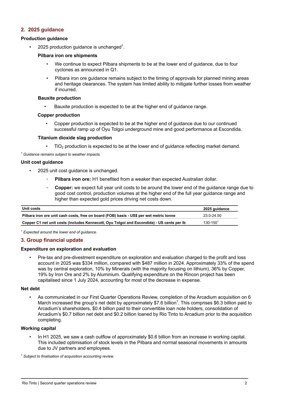 2. 2025 guidance Production guidance • 2025 production guidance is unchanged1. Pilbara iron ore shipments • We continue to expect Pilbara shipments to be at the lower end of guidance, due to four cyclones as announced in Q1. • Pilbara iron ore guidance remains subject to the timing of approvals for planned mining areas and heritage clearances. The system has limited ability to mitigate further losses from weather if incurred. Bauxite production • Bauxite production is expected to be at the higher end of guidance range. Copper production • Copper production is expected to be at the higher end of guidance due to our continued successful ramp up of Oyu Tolgoi underground mine and good performance at Escondida. Titanium dioxide slag production • TiO2 production is expected to be at the lower end of guidance reflecting market demand. 1 Guidance remains subject to weather impacts. Unit cost guidance • 2025 unit cost guidance is unchanged. ◦ Pilbara iron ore: H1 benefited from a weaker than expected Australian dollar. ◦ Copper: we expect full year unit costs to be around the lower end of the guidance range due to good cost control, production volumes at the higher end of the full year guidance range and higher than expected gold prices driving net costs down. Unit costs 2025 guidance Pilbara iron ore unit cash costs, free on board (FOB) basis - US$ per wet metric tonne 23.0-24.50 Copper C1 net unit costs (includes Kennecott, Oyu Tolgoi and Escondida) - US cents per lb 130-1501 1 Expected around the lower end of guidance. 3. Group financial update Expenditure on exploration and evaluation • Pre-tax and pre-divestment expenditure on exploration and evaluation charged to the profit and loss account in 2025 was $334 million, compared with $487 million in 2024. Approximately 33% of the spend was by central exploration, 10% by Minerals (with the majority focusing on lithium), 36% by Copper, 19% by Iron Ore and 2% by Aluminium. Qualifying expenditure on the Rincon project has been capitalised since 1 July 2024, accounting for most of the decrease in expense. Net debt • As communicated in our First Quarter Operations Review, completion of the Arcadium acquisition on 6 March increased the group’s net debt by approximately $7.6 billion1. This comprises $6.3 billion paid to Arcadium’s shareholders, $0.4 billion paid to their convertible loan note holders, consolidation of Arcadium’s $0.7 billion net debt and $0.2 billion loaned by Rio Tinto to Arcadium prior to the acquisition completing. Working capital • In H1 2025, we saw a cash outflow of approximately $0.6 billion from an increase in working capital. This included optimisation of stock levels in the Pilbara and normal seasonal movements in amounts due to JV partners and employees. 1 Subject to finalisation of acquisition accounting review. Rio Tinto | Second quarter operations review 2