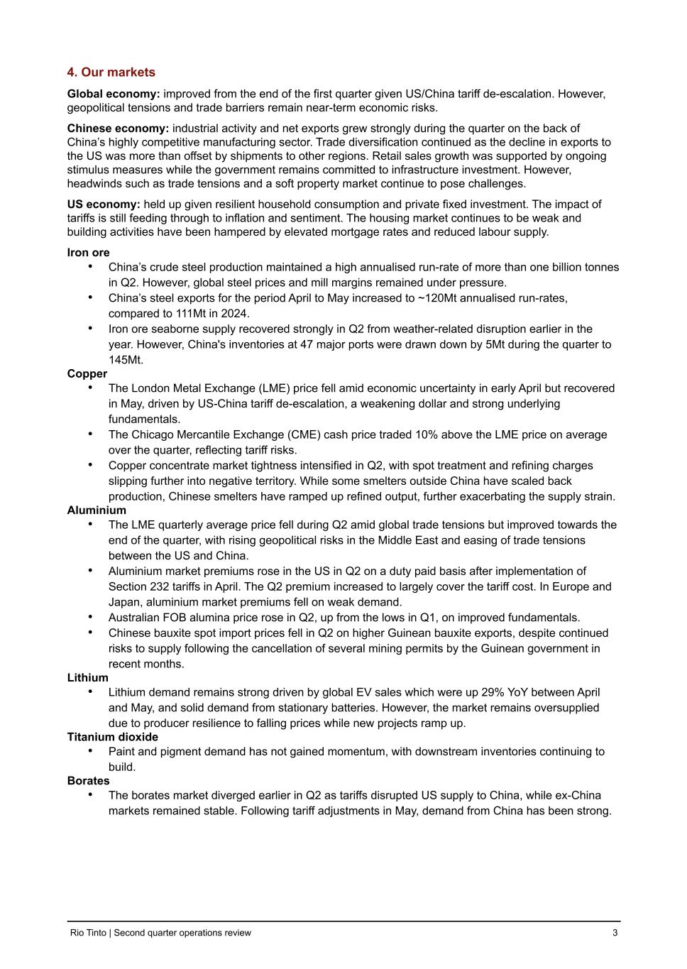 4. Our markets Global economy: improved from the end of the first quarter given US/China tariff de-escalation. However, geopolitical tensions and trade barriers remain near-term economic risks. Chinese economy: industrial activity and net exports grew strongly during the quarter on the back of China’s highly competitive manufacturing sector. Trade diversification continued as the decline in exports to the US was more than offset by shipments to other regions. Retail sales growth was supported by ongoing stimulus measures while the government remains committed to infrastructure investment. However, headwinds such as trade tensions and a soft property market continue to pose challenges. US economy: held up given resilient household consumption and private fixed investment. The impact of tariffs is still feeding through to inflation and sentiment. The housing market continues to be weak and building activities have been hampered by elevated mortgage rates and reduced labour supply. Iron ore • China’s crude steel production maintained a high annualised run-rate of more than one billion tonnes in Q2. However, global steel prices and mill margins remained under pressure. • China’s steel exports for the period April to May increased to ~120Mt annualised run-rates, compared to 111Mt in 2024. • Iron ore seaborne supply recovered strongly in Q2 from weather-related disruption earlier in the year. However, China's inventories at 47 major ports were drawn down by 5Mt during the quarter to 145Mt. Copper • The London Metal Exchange (LME) price fell amid economic uncertainty in early April but recovered in May, driven by US-China tariff de-escalation, a weakening dollar and strong underlying fundamentals. • The Chicago Mercantile Exchange (CME) cash price traded 10% above the LME price on average over the quarter, reflecting tariff risks. • Copper concentrate market tightness intensified in Q2, with spot treatment and refining charges slipping further into negative territory. While some smelters outside China have scaled back production, Chinese smelters have ramped up refined output, further exacerbating the supply strain. Aluminium • The LME quarterly average price fell during Q2 amid global trade tensions but improved towards the end of the quarter, with rising geopolitical risks in the Middle East and easing of trade tensions between the US and China. • Aluminium market premiums rose in the US in Q2 on a duty paid basis after implementation of Section 232 tariffs in April. The Q2 premium increased to largely cover the tariff cost. In Europe and Japan, aluminium market premiums fell on weak demand. • Australian FOB alumina price rose in Q2, up from the lows in Q1, on improved fundamentals. • Chinese bauxite spot import prices fell in Q2 on higher Guinean bauxite exports, despite continued risks to supply following the cancellation of several mining permits by the Guinean government in recent months. Lithium • Lithium demand remains strong driven by global EV sales which were up 29% YoY between April and May, and solid demand from stationary batteries. However, the market remains oversupplied due to producer resilience to falling prices while new projects ramp up. Titanium dioxide • Paint and pigment demand has not gained momentum, with downstream inventories continuing to build. Borates • The borates market diverged earlier in Q2 as tariffs disrupted US supply to China, while ex-China markets remained stable. Following tariff adjustments in May, demand from China has been strong. Rio Tinto | Second quarter operations review 3