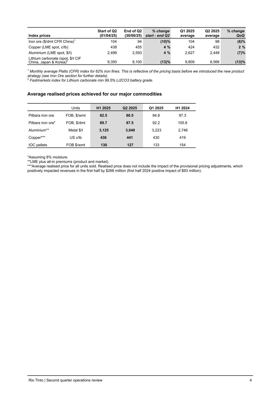 Index prices Start of Q2 (01/04/25) End of Q2 (30/06/25) % change start - end Q2 Q1 2025 average Q2 2025 average % change QoQ Iron ore ($/dmt CFR China)1 104 94 (10) % 104 98 (6) % Copper (LME spot, c/lb) 438 455 4 % 424 432 2 % Aluminium (LME spot, $/t) 2,499 2,593 4 % 2,627 2,448 (7) % Lithium carbonate (spot, $/t CIF China, Japan & Korea)2 9,350 8,100 (13) % 9,809 8,566 (13) % 1 Monthly average Platts (CFR) index for 62% iron fines. This is reflective of the pricing basis before we introduced the new product strategy (see Iron Ore section for further details). 2 Fastmarkets index for Lithium carbonate min 99.5% Li2CO3 battery grade. Average realised prices achieved for our major commodities Units H1 2025 Q2 2025 Q1 2025 H1 2024 Pilbara iron ore FOB, $/wmt 82.5 80.5 84.8 97.3 Pilbara iron ore* FOB, $/dmt 89.7 87.5 92.2 105.8 Aluminium** Metal $/t 3,125 3,040 3,223 2,746 Copper*** US c/lb 436 441 430 419 IOC pellets FOB $/wmt 130 127 133 154 *Assuming 8% moisture. **LME plus all-in premiums (product and market). ***Average realised price for all units sold. Realised price does not include the impact of the provisional pricing adjustments, which positively impacted revenues in the first half by $266 million (first half 2024 positive impact of $93 million). Rio Tinto | Second quarter operations review 4