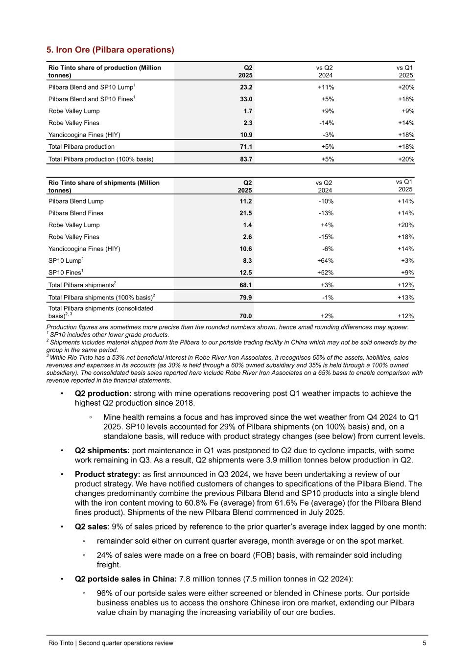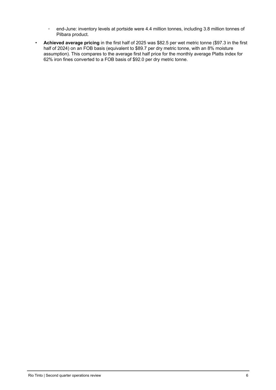 5. Iron Ore (Pilbara operations) Rio Tinto share of production (Million tonnes) Q2 2025 vs Q2 2024 vs Q1 2025 Pilbara Blend and SP10 Lump1 23.2 +11 % +20 % Pilbara Blend and SP10 Fines1 33.0 +5 % +18 % Robe Valley Lump 1.7 +9 % +9 % Robe Valley Fines 2.3 -14 % +14 % Yandicoogina Fines (HIY) 10.9 -3 % +18 % Total Pilbara production 71.1 +5 % +18 % Total Pilbara production (100% basis) 83.7 +5 % +20 % Rio Tinto share of shipments (Million tonnes) Q2 2025 vs Q2 2024 vs Q1 2025 Pilbara Blend Lump 11.2 -10 % +14 % Pilbara Blend Fines 21.5 -13 % +14 % Robe Valley Lump 1.4 +4 % +20 % Robe Valley Fines 2.6 -15 % +18 % Yandicoogina Fines (HIY) 10.6 -6 % +14 % SP10 Lump1 8.3 +64 % +3 % SP10 Fines1 12.5 +52 % +9 % Total Pilbara shipments2 68.1 +3 % +12 % Total Pilbara shipments (100% basis)2 79.9 -1 % +13 % Total Pilbara shipments (consolidated basis)2, 3 70.0 +2 % +12 % Production figures are sometimes more precise than the rounded numbers shown, hence small rounding differences may appear. 1 SP10 includes other lower grade products. 2 Shipments includes material shipped from the Pilbara to our portside trading facility in China which may not be sold onwards by the group in the same period. 3 While Rio Tinto has a 53% net beneficial interest in Robe River Iron Associates, it recognises 65% of the assets, liabilities, sales revenues and expenses in its accounts (as 30% is held through a 60% owned subsidiary and 35% is held through a 100% owned subsidiary). The consolidated basis sales reported here include Robe River Iron Associates on a 65% basis to enable comparison with revenue reported in the financial statements. • Q2 production: strong with mine operations recovering post Q1 weather impacts to achieve the highest Q2 production since 2018. ◦ Mine health remains a focus and has improved since the wet weather from Q4 2024 to Q1 2025. SP10 levels accounted for 29% of Pilbara shipments (on 100% basis) and, on a standalone basis, will reduce with product strategy changes (see below) from current levels. • Q2 shipments: port maintenance in Q1 was postponed to Q2 due to cyclone impacts, with some work remaining in Q3. As a result, Q2 shipments were 3.9 million tonnes below production in Q2. • Product strategy: as first announced in Q3 2024, we have been undertaking a review of our product strategy. We have notified customers of changes to specifications of the Pilbara Blend. The changes predominantly combine the previous Pilbara Blend and SP10 products into a single blend with the iron content moving to 60.8% Fe (average) from 61.6% Fe (average) (for the Pilbara Blend fines product). Shipments of the new Pilbara Blend commenced in July 2025. • Q2 sales: 9% of sales priced by reference to the prior quarter’s average index lagged by one month: ◦ remainder sold either on current quarter average, month average or on the spot market. ◦ 24% of sales were made on a free on board (FOB) basis, with remainder sold including freight. • Q2 portside sales in China: 7.8 million tonnes (7.5 million tonnes in Q2 2024): ◦ 96% of our portside sales were either screened or blended in Chinese ports. Our portside business enables us to access the onshore Chinese iron ore market, extending our Pilbara value chain by managing the increasing variability of our ore bodies. Rio Tinto | Second quarter operations review 5