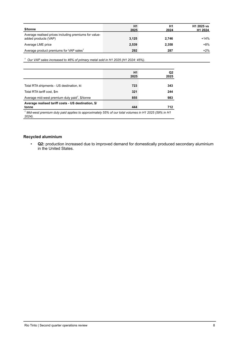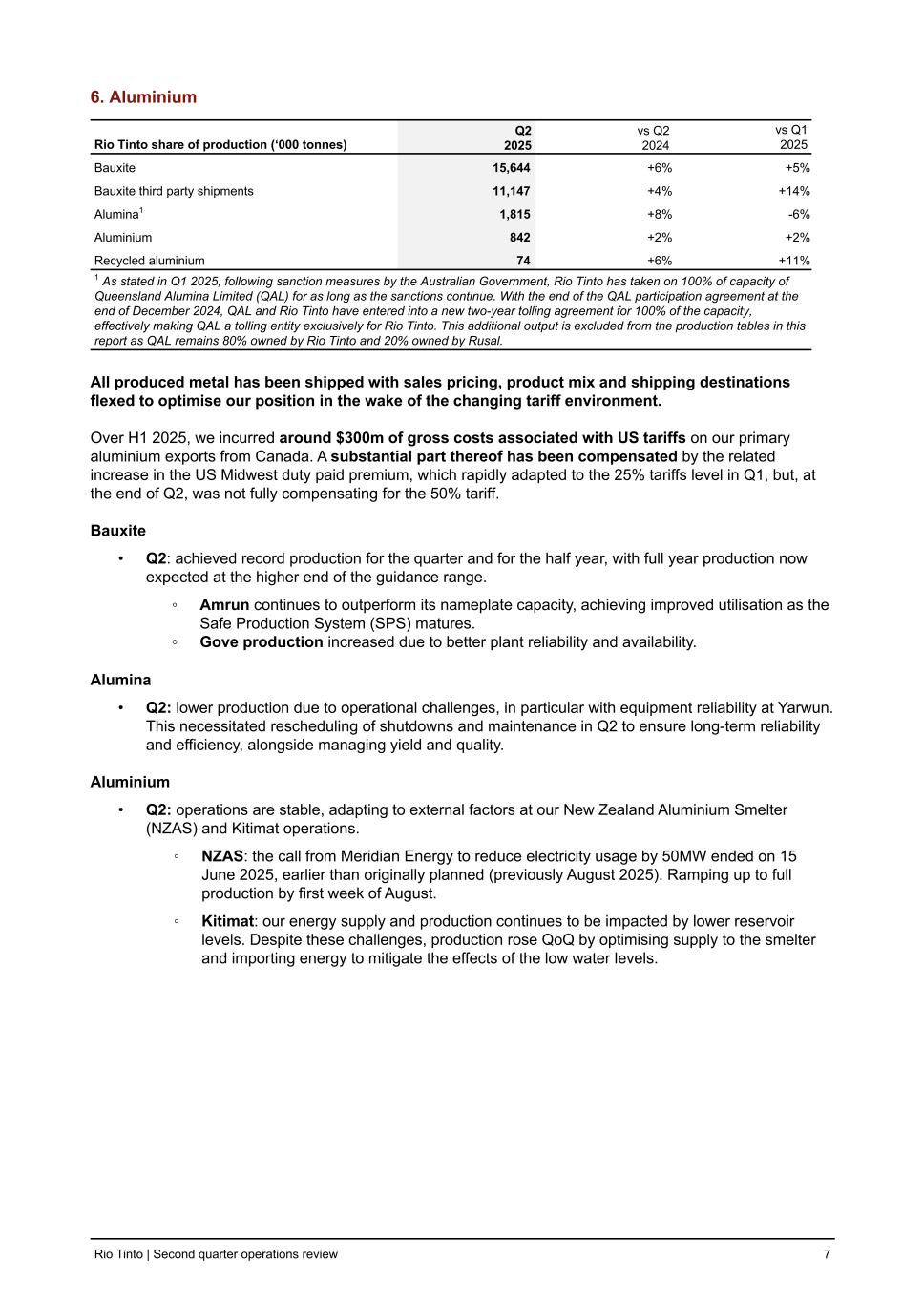 6. Aluminium Rio Tinto share of production (‘000 tonnes) Q2 2025 vs Q2 2024 vs Q1 2025 Bauxite 15,644 +6 % +5 % Bauxite third party shipments 11,147 +4 % +14 % Alumina1 1,815 +8 % -6 % Aluminium 842 +2 % +2 % Recycled aluminium 74 +6 % +11 % 1 As stated in Q1 2025, following sanction measures by the Australian Government, Rio Tinto has taken on 100% of capacity of Queensland Alumina Limited (QAL) for as long as the sanctions continue. With the end of the QAL participation agreement at the end of December 2024, QAL and Rio Tinto have entered into a new two-year tolling agreement for 100% of the capacity, effectively making QAL a tolling entity exclusively for Rio Tinto. This additional output is excluded from the production tables in this report as QAL remains 80% owned by Rio Tinto and 20% owned by Rusal. All produced metal has been shipped with sales pricing, product mix and shipping destinations flexed to optimise our position in the wake of the changing tariff environment. Over H1 2025, we incurred around $300m of gross costs associated with US tariffs on our primary aluminium exports from Canada. A substantial part thereof has been compensated by the related increase in the US Midwest duty paid premium, which rapidly adapted to the 25% tariffs level in Q1, but, at the end of Q2, was not fully compensating for the 50% tariff. Bauxite • Q2: achieved record production for the quarter and for the half year, with full year production now expected at the higher end of the guidance range. ◦ Amrun continues to outperform its nameplate capacity, achieving improved utilisation as the Safe Production System (SPS) matures. ◦ Gove production increased due to better plant reliability and availability. Alumina • Q2: lower production due to operational challenges, in particular with equipment reliability at Yarwun. This necessitated rescheduling of shutdowns and maintenance in Q2 to ensure long-term reliability and efficiency, alongside managing yield and quality. Aluminium • Q2: operations are stable, adapting to external factors at our New Zealand Aluminium Smelter (NZAS) and Kitimat operations. ◦ NZAS: the call from Meridian Energy to reduce electricity usage by 50MW ended on 15 June 2025, earlier than originally planned (previously August 2025). Ramping up to full production by first week of August. ◦ Kitimat: our energy supply and production continues to be impacted by lower reservoir levels. Despite these challenges, production rose QoQ by optimising supply to the smelter and importing energy to mitigate the effects of the low water levels. Rio Tinto | Second quarter operations review 7