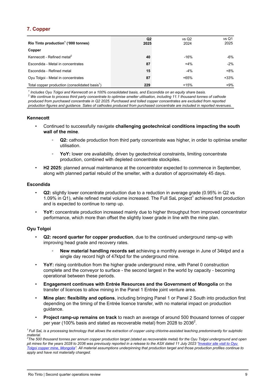 7. Copper Rio Tinto production1 (‘000 tonnes) Q2 2025 vs Q2 2024 vs Q1 2025 Copper Kennecott - Refined metal2 40 -16 % -6 % Escondida - Metal in concentrates 87 +4 % -2 % Escondida - Refined metal 15 -4 % +8 % Oyu Tolgoi - Metal in concentrates 87 +65 % +33 % Total copper production (consolidated basis1) 229 +15 % +9 % 1 Includes Oyu Tolgoi and Kennecott on a 100% consolidated basis, and Escondida on an equity share basis. 2 We continue to process third party concentrate to optimise smelter utilisation, including 11.1 thousand tonnes of cathode produced from purchased concentrate in Q2 2025. Purchased and tolled copper concentrates are excluded from reported production figures and guidance. Sales of cathodes produced from purchased concentrate are included in reported revenues. Kennecott • Continued to successfully navigate challenging geotechnical conditions impacting the south wall of the mine. ◦ Q2: cathode production from third party concentrate was higher, in order to optimise smelter utilisation. ◦ YoY: lower ore availability, driven by geotechnical constraints, limiting concentrate production, combined with depleted concentrate stockpiles. • H2 2025: planned annual maintenance at the concentrator expected to commence in September, along with planned partial rebuild of the smelter, with a duration of approximately 45 days. Escondida • Q2: slightly lower concentrate production due to a reduction in average grade (0.95% in Q2 vs 1.09% in Q1), while refined metal volume increased. The Full SaL project1 achieved first production and is expected to continue to ramp up. • YoY: concentrate production increased mainly due to higher throughput from improved concentrator performance, which more than offset the slightly lower grade in line with the mine plan. Oyu Tolgoi • Q2: record quarter for copper production, due to the continued underground ramp-up with improving head grade and recovery rates. ◦ New material handling records set achieving a monthly average in June of 34ktpd and a single day record high of 47ktpd for the underground mine. • YoY: rising contribution from the higher grade underground mine, with Panel 0 construction complete and the conveyor to surface - the second largest in the world by capacity - becoming operational between these periods. • Engagement continues with Entrée Resources and the Government of Mongolia on the transfer of licences to allow mining in the Panel 1 Entrée joint venture area. • Mine plan: flexibility and options, including bringing Panel 1 or Panel 2 South into production first depending on the timing of the Entrée licence transfer, with no material impact on production guidance. • Project ramp-up remains on track to reach an average of around 500 thousand tonnes of copper per year (100% basis and stated as recoverable metal) from 2028 to 20362. 1 Full SaL is a processing technology that allows the extraction of copper using chlorine-assisted leaching predominantly for sulphidic material. 2The 500 thousand tonnes per annum copper production target (stated as recoverable metal) for the Oyu Tolgoi underground and open pit mines for the years 2028 to 2036 was previously reported in a release to the ASX dated 11 July 2023 “Investor site visit to Oyu Tolgoi copper mine, Mongolia”. All material assumptions underpinning that production target and those production profiles continue to apply and have not materially changed. Rio Tinto | Second quarter operations review 9