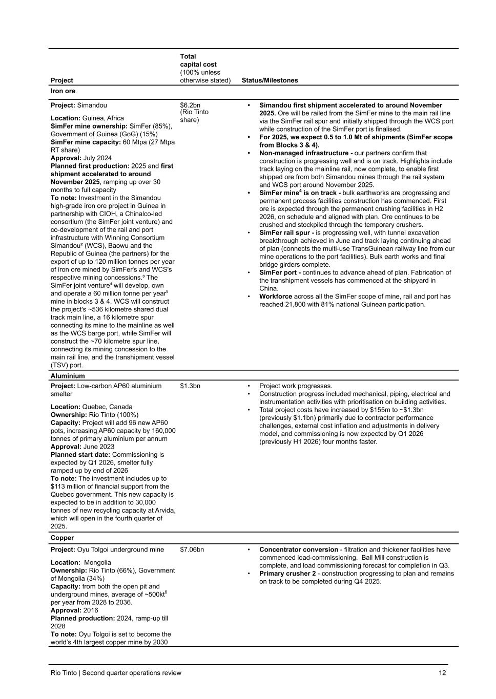 Project Total capital cost (100% unless otherwise stated) Status/Milestones Iron ore Project: Simandou Location: Guinea, Africa SimFer mine ownership: SimFer (85%), Government of Guinea (GoG) (15%) SimFer mine capacity: 60 Mtpa (27 Mtpa RT share) Approval: July 2024 Planned first production: 2025 and first shipment accelerated to around November 2025, ramping up over 30 months to full capacity To note: Investment in the Simandou high-grade iron ore project in Guinea in partnership with CIOH, a Chinalco-led consortium (the SimFer joint venture) and co-development of the rail and port infrastructure with Winning Consortium Simandou² (WCS), Baowu and the Republic of Guinea (the partners) for the export of up to 120 million tonnes per year of iron ore mined by SimFer's and WCS's respective mining concessions.³ The SimFer joint venture⁴ will develop, own and operate a 60 million tonne per year⁵ mine in blocks 3 & 4. WCS will construct the project's ~536 kilometre shared dual track main line, a 16 kilometre spur connecting its mine to the mainline as well as the WCS barge port, while SimFer will construct the ~70 kilometre spur line, connecting its mining concession to the main rail line, and the transhipment vessel (TSV) port. $6.2bn (Rio Tinto share) • Simandou first shipment accelerated to around November 2025. Ore will be railed from the SimFer mine to the main rail line via the SimFer rail spur and initially shipped through the WCS port while construction of the SimFer port is finalised. • For 2025, we expect 0.5 to 1.0 Mt of shipments (SimFer scope from Blocks 3 & 4). • Non-managed infrastructure - our partners confirm that construction is progressing well and is on track. Highlights include track laying on the mainline rail, now complete, to enable first shipped ore from both Simandou mines through the rail system and WCS port around November 2025. • SimFer mine4 is on track - bulk earthworks are progressing and permanent process facilities construction has commenced. First ore is expected through the permanent crushing facilities in H2 2026, on schedule and aligned with plan. Ore continues to be crushed and stockpiled through the temporary crushers. • SimFer rail spur - is progressing well, with tunnel excavation breakthrough achieved in June and track laying continuing ahead of plan (connects the multi-use TransGuinean railway line from our mine operations to the port facilities). Bulk earth works and final bridge girders complete. • SimFer port - continues to advance ahead of plan. Fabrication of the transhipment vessels has commenced at the shipyard in China. • Workforce across all the SimFer scope of mine, rail and port has reached 21,800 with 81% national Guinean participation. Aluminium Project: Low-carbon AP60 aluminium smelter Location: Quebec, Canada Ownership: Rio Tinto (100%) Capacity: Project will add 96 new AP60 pots, increasing AP60 capacity by 160,000 tonnes of primary aluminium per annum Approval: June 2023 Planned start date: Commissioning is expected by Q1 2026, smelter fully ramped up by end of 2026 To note: The investment includes up to $113 million of financial support from the Quebec government. This new capacity is expected to be in addition to 30,000 tonnes of new recycling capacity at Arvida, which will open in the fourth quarter of 2025. $1.3bn • Project work progresses. • Construction progress included mechanical, piping, electrical and instrumentation activities with prioritisation on building activities. • Total project costs have increased by $155m to ~$1.3bn (previously $1.1bn) primarily due to contractor performance challenges, external cost inflation and adjustments in delivery model, and commissioning is now expected by Q1 2026 (previously H1 2026) four months faster. Copper Project: Oyu Tolgoi underground mine Location: Mongolia Ownership: Rio Tinto (66%), Government of Mongolia (34%) Capacity: from both the open pit and underground mines, average of ~500kt6 per year from 2028 to 2036. Approval: 2016 Planned production: 2024, ramp-up till 2028 To note: Oyu Tolgoi is set to become the world’s 4th largest copper mine by 2030 $7.06bn • Concentrator conversion - filtration and thickener facilities have commenced load-commissioning. Ball Mill construction is complete, and load commissioning forecast for completion in Q3. • Primary crusher 2 - construction progressing to plan and remains on track to be completed during Q4 2025. Rio Tinto | Second quarter operations review 12