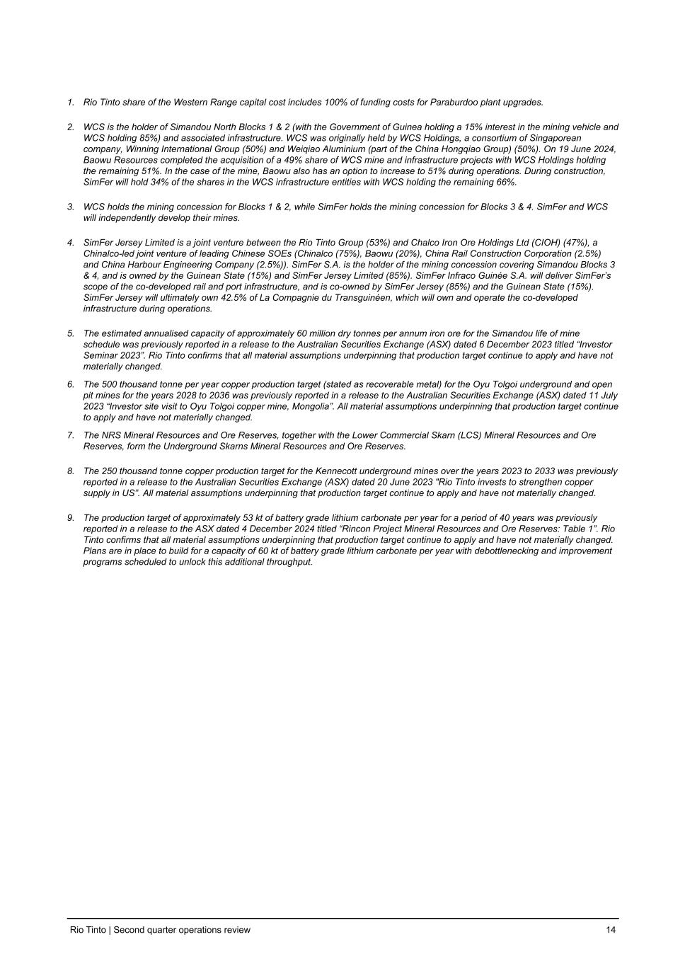 1. Rio Tinto share of the Western Range capital cost includes 100% of funding costs for Paraburdoo plant upgrades. 2. WCS is the holder of Simandou North Blocks 1 & 2 (with the Government of Guinea holding a 15% interest in the mining vehicle and WCS holding 85%) and associated infrastructure. WCS was originally held by WCS Holdings, a consortium of Singaporean company, Winning International Group (50%) and Weiqiao Aluminium (part of the China Hongqiao Group) (50%). On 19 June 2024, Baowu Resources completed the acquisition of a 49% share of WCS mine and infrastructure projects with WCS Holdings holding the remaining 51%. In the case of the mine, Baowu also has an option to increase to 51% during operations. During construction, SimFer will hold 34% of the shares in the WCS infrastructure entities with WCS holding the remaining 66%. 3. WCS holds the mining concession for Blocks 1 & 2, while SimFer holds the mining concession for Blocks 3 & 4. SimFer and WCS will independently develop their mines. 4. SimFer Jersey Limited is a joint venture between the Rio Tinto Group (53%) and Chalco Iron Ore Holdings Ltd (CIOH) (47%), a Chinalco-led joint venture of leading Chinese SOEs (Chinalco (75%), Baowu (20%), China Rail Construction Corporation (2.5%) and China Harbour Engineering Company (2.5%)). SimFer S.A. is the holder of the mining concession covering Simandou Blocks 3 & 4, and is owned by the Guinean State (15%) and SimFer Jersey Limited (85%). SimFer Infraco Guinée S.A. will deliver SimFer’s scope of the co-developed rail and port infrastructure, and is co-owned by SimFer Jersey (85%) and the Guinean State (15%). SimFer Jersey will ultimately own 42.5% of La Compagnie du Transguinéen, which will own and operate the co-developed infrastructure during operations. 5. The estimated annualised capacity of approximately 60 million dry tonnes per annum iron ore for the Simandou life of mine schedule was previously reported in a release to the Australian Securities Exchange (ASX) dated 6 December 2023 titled “Investor Seminar 2023”. Rio Tinto confirms that all material assumptions underpinning that production target continue to apply and have not materially changed. 6. The 500 thousand tonne per year copper production target (stated as recoverable metal) for the Oyu Tolgoi underground and open pit mines for the years 2028 to 2036 was previously reported in a release to the Australian Securities Exchange (ASX) dated 11 July 2023 “Investor site visit to Oyu Tolgoi copper mine, Mongolia”. All material assumptions underpinning that production target continue to apply and have not materially changed. 7. The NRS Mineral Resources and Ore Reserves, together with the Lower Commercial Skarn (LCS) Mineral Resources and Ore Reserves, form the Underground Skarns Mineral Resources and Ore Reserves. 8. The 250 thousand tonne copper production target for the Kennecott underground mines over the years 2023 to 2033 was previously reported in a release to the Australian Securities Exchange (ASX) dated 20 June 2023 "Rio Tinto invests to strengthen copper supply in US”. All material assumptions underpinning that production target continue to apply and have not materially changed. 9. The production target of approximately 53 kt of battery grade lithium carbonate per year for a period of 40 years was previously reported in a release to the ASX dated 4 December 2024 titled “Rincon Project Mineral Resources and Ore Reserves: Table 1”. Rio Tinto confirms that all material assumptions underpinning that production target continue to apply and have not materially changed. Plans are in place to build for a capacity of 60 kt of battery grade lithium carbonate per year with debottlenecking and improvement programs scheduled to unlock this additional throughput. Rio Tinto | Second quarter operations review 14