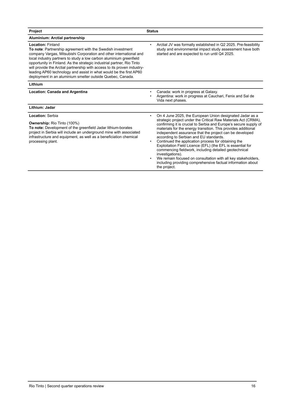 Project Status Aluminium: Arctial partnership Location: Finland To note: Partnership agreement with the Swedish investment company Vargas, Mitsubishi Corporation and other international and local industry partners to study a low carbon aluminium greenfield opportunity in Finland. As the strategic industrial partner, Rio Tinto will provide the Arctial partnership with access to its proven industry- leading AP60 technology and assist in what would be the first AP60 deployment in an aluminium smelter outside Quebec, Canada. • Arctial JV was formally established in Q2 2025. Pre-feasibility study and environmental impact study assessment have both started and are expected to run until Q4 2025. Lithium Location: Canada and Argentina • Canada: work in progress at Galaxy. • Argentina: work in progress at Cauchari, Fenix and Sal de Vida next phases. Lithium: Jadar Location: Serbia Ownership: Rio Tinto (100%) To note: Development of the greenfield Jadar lithium-borates project in Serbia will include an underground mine with associated infrastructure and equipment, as well as a beneficiation chemical processing plant. • On 4 June 2025, the European Union designated Jadar as a strategic project under the Critical Raw Materials Act (CRMA), confirming it is crucial to Serbia and Europe’s secure supply of materials for the energy transition. This provides additional independent assurance that the project can be developed according to Serbian and EU standards. • Continued the application process for obtaining the Exploitation Field Licence (EFL) (the EFL is essential for commencing fieldwork, including detailed geotechnical investigations). • We remain focused on consultation with all key stakeholders, including providing comprehensive factual information about the project. Rio Tinto | Second quarter operations review 16