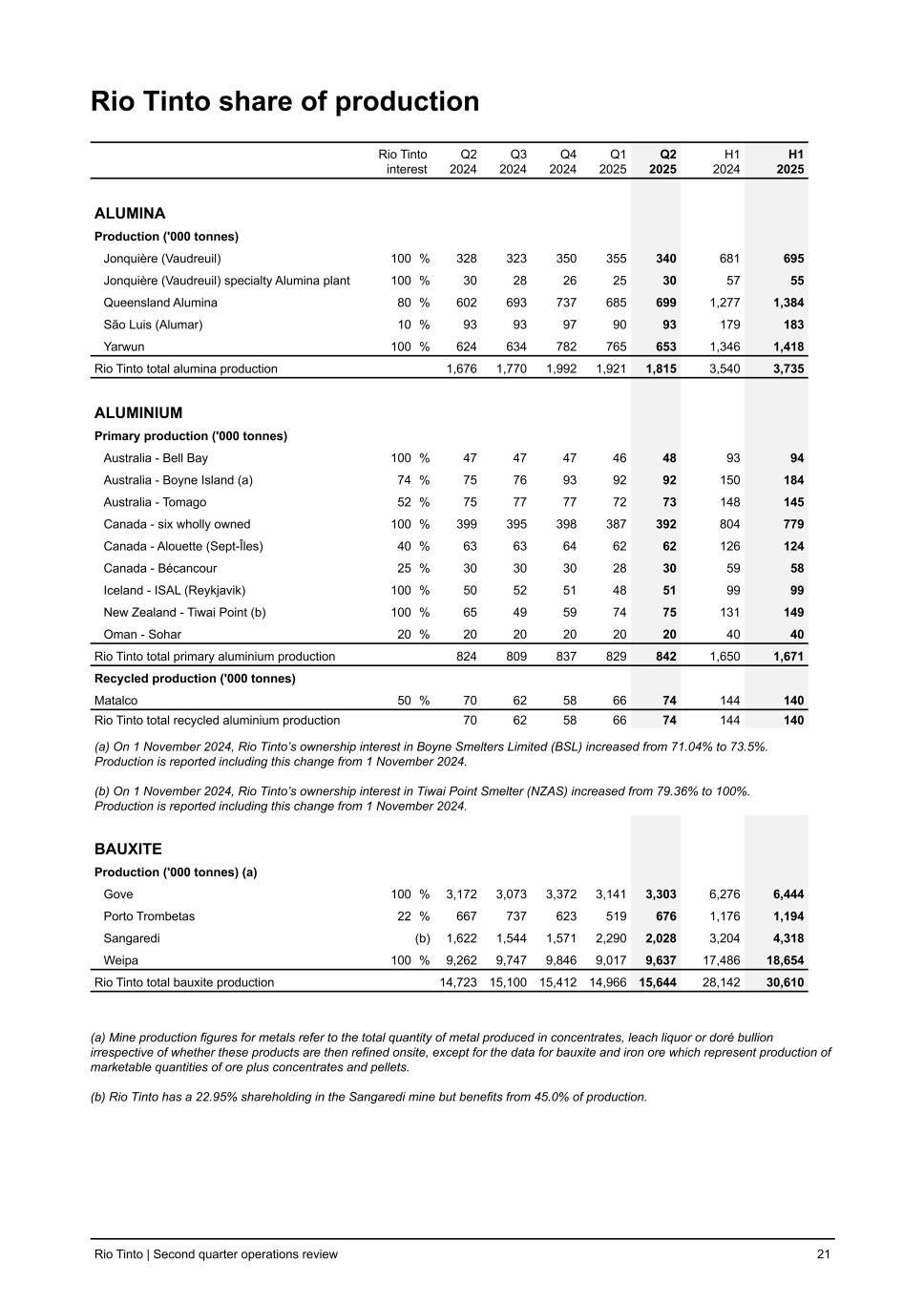 Rio Tinto share of production Rio Tinto interest Q2 2024 Q3 2024 Q4 2024 Q1 2025 Q2 2025 H1 2024 H1 2025 ALUMINA Production ('000 tonnes) Jonquière (Vaudreuil) 100 % 328 323 350 355 340 681 695 Jonquière (Vaudreuil) specialty Alumina plant 100 % 30 28 26 25 30 57 55 Queensland Alumina 80 % 602 693 737 685 699 1,277 1,384 São Luis (Alumar) 10 % 93 93 97 90 93 179 183 Yarwun 100 % 624 634 782 765 653 1,346 1,418 Rio Tinto total alumina production 1,676 1,770 1,992 1,921 1,815 3,540 3,735 ALUMINIUM Primary production ('000 tonnes) Australia - Bell Bay 100 % 47 47 47 46 48 93 94 Australia - Boyne Island (a) 74 % 75 76 93 92 92 150 184 Australia - Tomago 52 % 75 77 77 72 73 148 145 Canada - six wholly owned 100 % 399 395 398 387 392 804 779 Canada - Alouette (Sept-Îles) 40 % 63 63 64 62 62 126 124 Canada - Bécancour 25 % 30 30 30 28 30 59 58 Iceland - ISAL (Reykjavik) 100 % 50 52 51 48 51 99 99 New Zealand - Tiwai Point (b) 100 % 65 49 59 74 75 131 149 Oman - Sohar 20 % 20 20 20 20 20 40 40 Rio Tinto total primary aluminium production 824 809 837 829 842 1,650 1,671 Recycled production ('000 tonnes) Matalco 50 % 70 62 58 66 74 144 140 Rio Tinto total recycled aluminium production 70 62 58 66 74 144 140 (a) On 1 November 2024, Rio Tinto’s ownership interest in Boyne Smelters Limited (BSL) increased from 71.04% to 73.5%. Production is reported including this change from 1 November 2024. (b) On 1 November 2024, Rio Tinto’s ownership interest in Tiwai Point Smelter (NZAS) increased from 79.36% to 100%. Production is reported including this change from 1 November 2024. BAUXITE Production ('000 tonnes) (a) Gove 100 % 3,172 3,073 3,372 3,141 3,303 6,276 6,444 Porto Trombetas 22 % 667 737 623 519 676 1,176 1,194 Sangaredi (b) 1,622 1,544 1,571 2,290 2,028 3,204 4,318 Weipa 100 % 9,262 9,747 9,846 9,017 9,637 17,486 18,654 Rio Tinto total bauxite production 14,723 15,100 15,412 14,966 15,644 28,142 30,610 (a) Mine production figures for metals refer to the total quantity of metal produced in concentrates, leach liquor or doré bullion irrespective of whether these products are then refined onsite, except for the data for bauxite and iron ore which represent production of marketable quantities of ore plus concentrates and pellets. (b) Rio Tinto has a 22.95% shareholding in the Sangaredi mine but benefits from 45.0% of production. Rio Tinto | Second quarter operations review 21
