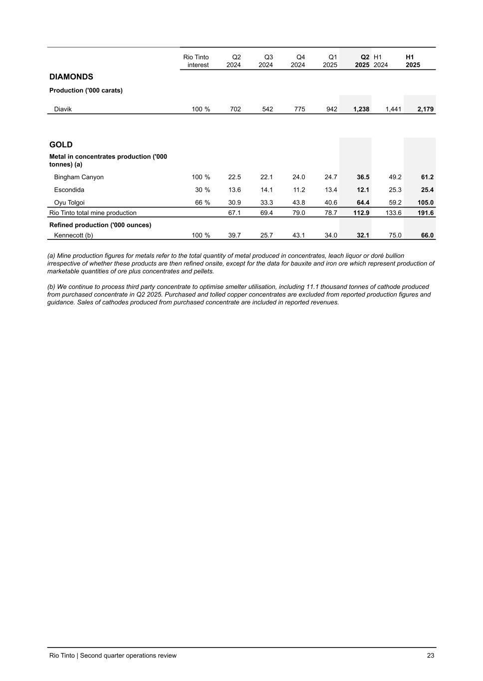 Rio Tinto interest Q2 2024 Q3 2024 Q4 2024 Q1 2025 Q2 2025 H1 2024 H1 2025 DIAMONDS Production ('000 carats) Diavik 100 % 702 542 775 942 1,238 1,441 2,179 GOLD Metal in concentrates production ('000 tonnes) (a) Bingham Canyon 100 % 22.5 22.1 24.0 24.7 36.5 49.2 61.2 Escondida 30 % 13.6 14.1 11.2 13.4 12.1 25.3 25.4 Oyu Tolgoi 66 % 30.9 33.3 43.8 40.6 64.4 59.2 105.0 Rio Tinto total mine production 67.1 69.4 79.0 78.7 112.9 133.6 191.6 Refined production ('000 ounces) Kennecott (b) 100 % 39.7 25.7 43.1 34.0 32.1 75.0 66.0 (a) Mine production figures for metals refer to the total quantity of metal produced in concentrates, leach liquor or doré bullion irrespective of whether these products are then refined onsite, except for the data for bauxite and iron ore which represent production of marketable quantities of ore plus concentrates and pellets. (b) We continue to process third party concentrate to optimise smelter utilisation, including 11.1 thousand tonnes of cathode produced from purchased concentrate in Q2 2025. Purchased and tolled copper concentrates are excluded from reported production figures and guidance. Sales of cathodes produced from purchased concentrate are included in reported revenues. Rio Tinto | Second quarter operations review 23