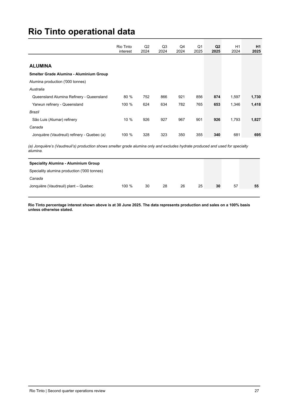 Rio Tinto operational data Rio Tinto interest Q2 2024 Q3 2024 Q4 2024 Q1 2025 Q2 2025 H1 2024 H1 2025 ALUMINA Smelter Grade Alumina - Aluminium Group Alumina production ('000 tonnes) Australia Queensland Alumina Refinery - Queensland 80 % 752 866 921 856 874 1,597 1,730 Yarwun refinery - Queensland 100 % 624 634 782 765 653 1,346 1,418 Brazil São Luis (Alumar) refinery 10 % 926 927 967 901 926 1,793 1,827 Canada Jonquière (Vaudreuil) refinery - Quebec (a) 100 % 328 323 350 355 340 681 695 (a) Jonquière’s (Vaudreuil’s) production shows smelter grade alumina only and excludes hydrate produced and used for specialty alumina. Speciality Alumina - Aluminium Group Speciality alumina production ('000 tonnes) Canada Jonquière (Vaudreuil) plant – Quebec 100 % 30 28 26 25 30 57 55 Rio Tinto percentage interest shown above is at 30 June 2025. The data represents production and sales on a 100% basis unless otherwise stated. Rio Tinto | Second quarter operations review 27