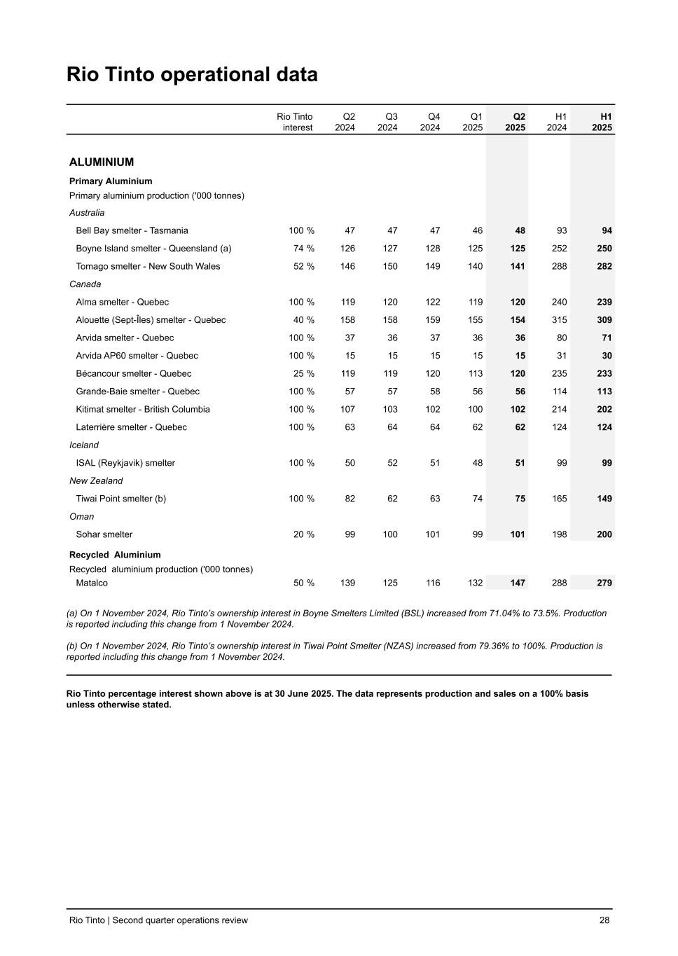 Rio Tinto operational data Rio Tinto interest Q2 2024 Q3 2024 Q4 2024 Q1 2025 Q2 2025 H1 2024 H1 2025 ALUMINIUM Primary Aluminium Primary aluminium production ('000 tonnes) Australia Bell Bay smelter - Tasmania 100 % 47 47 47 46 48 93 94 Boyne Island smelter - Queensland (a) 74 % 126 127 128 125 125 252 250 Tomago smelter - New South Wales 52 % 146 150 149 140 141 288 282 Canada Alma smelter - Quebec 100 % 119 120 122 119 120 240 239 Alouette (Sept-Îles) smelter - Quebec 40 % 158 158 159 155 154 315 309 Arvida smelter - Quebec 100 % 37 36 37 36 36 80 71 Arvida AP60 smelter - Quebec 100 % 15 15 15 15 15 31 30 Bécancour smelter - Quebec 25 % 119 119 120 113 120 235 233 Grande-Baie smelter - Quebec 100 % 57 57 58 56 56 114 113 Kitimat smelter - British Columbia 100 % 107 103 102 100 102 214 202 Laterrière smelter - Quebec 100 % 63 64 64 62 62 124 124 Iceland ISAL (Reykjavik) smelter 100 % 50 52 51 48 51 99 99 New Zealand Tiwai Point smelter (b) 100 % 82 62 63 74 75 165 149 Oman Sohar smelter 20 % 99 100 101 99 101 198 200 Recycled Aluminium Recycled aluminium production ('000 tonnes) Matalco 50 % 139 125 116 132 147 288 279 (a) On 1 November 2024, Rio Tinto’s ownership interest in Boyne Smelters Limited (BSL) increased from 71.04% to 73.5%. Production is reported including this change from 1 November 2024. (b) On 1 November 2024, Rio Tinto’s ownership interest in Tiwai Point Smelter (NZAS) increased from 79.36% to 100%. Production is reported including this change from 1 November 2024. Rio Tinto percentage interest shown above is at 30 June 2025. The data represents production and sales on a 100% basis unless otherwise stated. Rio Tinto | Second quarter operations review 28